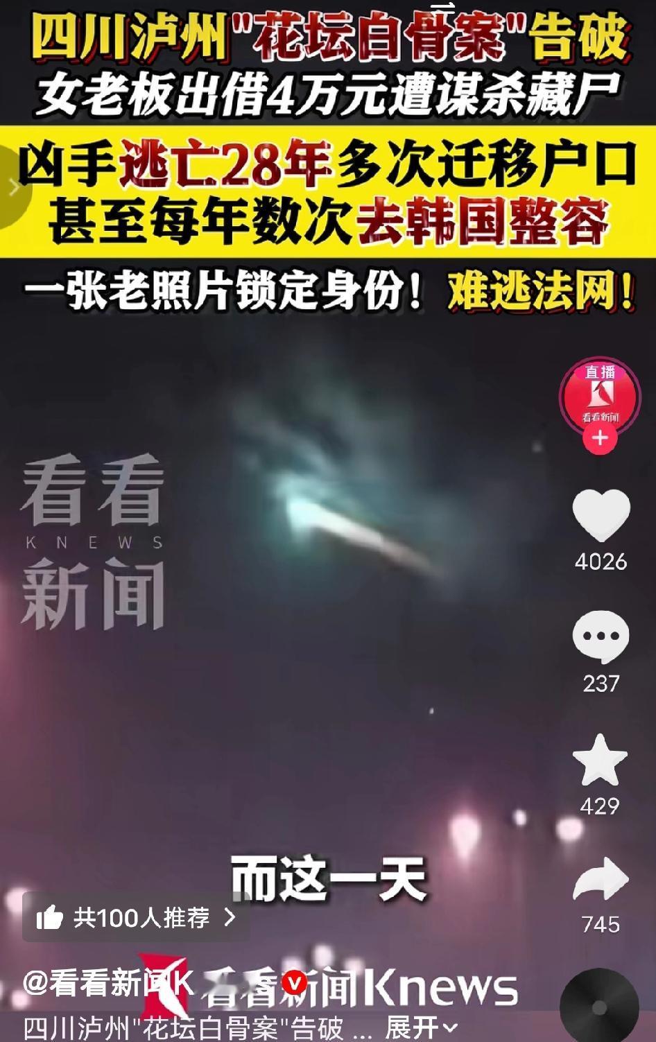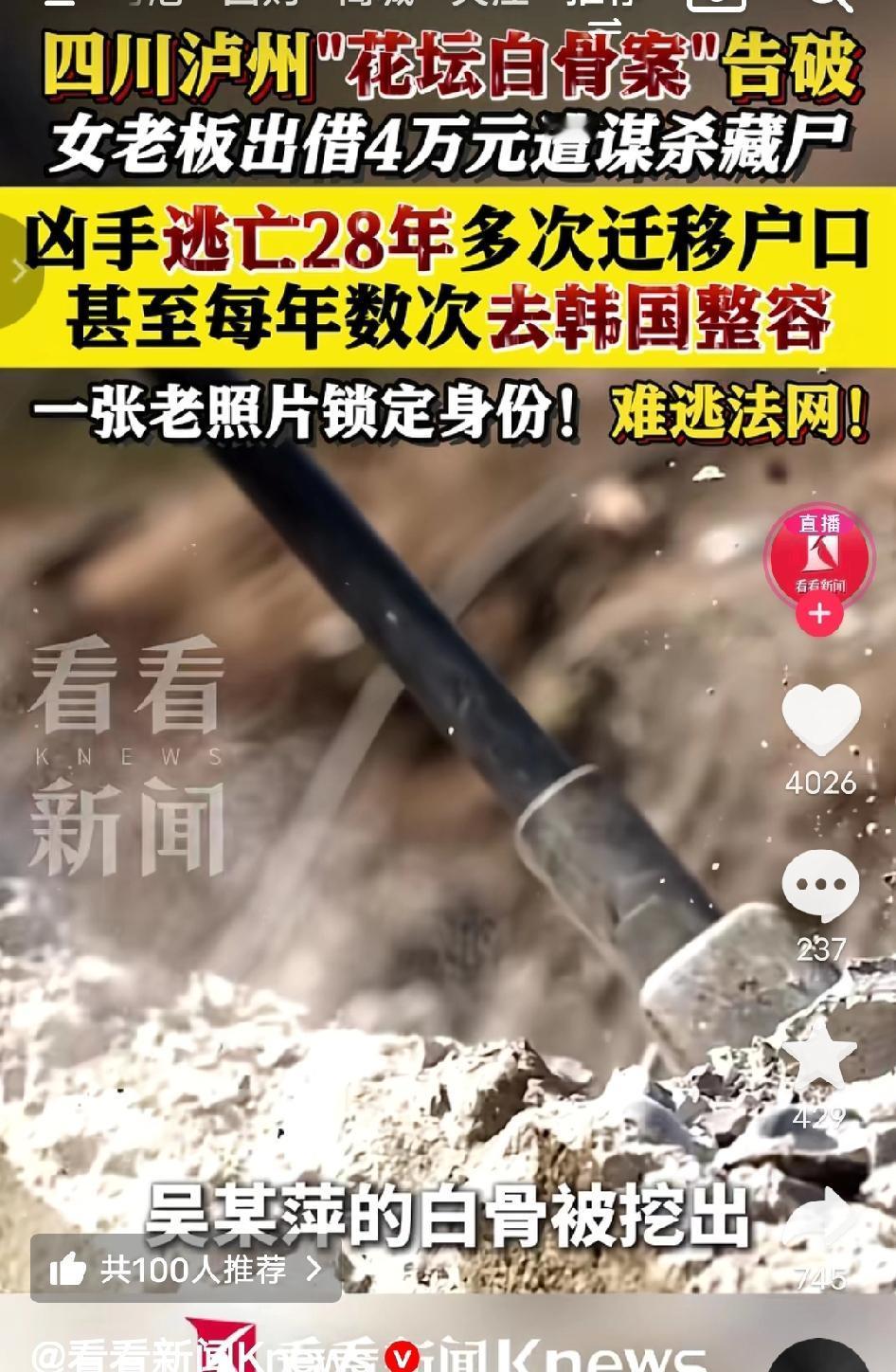 天网恢恢!四川泸州“花坛白骨案”告破:女老板借4万元竟遭谋杀,凶手疯狂“换脸”逃亡28年终落网,谁能想到竟栽在一张老照片上! 1997年除夕前,四川泸州公交商城的女老板吴某萍离奇失踪,活不见人死不见尸。谁也没想到,她被藏尸在商场九楼的花坛里,一埋就是28年。直到2025年夏天商场施工,敲开花坛瓷砖,这具白骨才重见天日。更让人震惊的是,凶手为了逃避追捕,不仅改名换姓、多次迁户口,还每年数次赴韩国整容“换脸”,最终还是栽在了一张老照片上! 吴某萍当年是泸州公交商城里小有名气的服装老板,为人热心。1997年,她借给同行陈某芬(后改名陈某宇)4万元周转,却没想到这笔善举成了催命符。 陈某芬无力偿还债务,竟伙同前夫杨某根(上海刑满释放人员)动了杀心。两人诱骗吴某萍到商场四楼的门市,将她残忍掐死,随后把尸体抬到九楼花坛掩埋,还抢走了她身上的金银首饰。案发后,这对夫妻立刻从商城消失,从此开启了长达28年的逃亡生涯。 为了彻底洗白身份,陈某芬改名为陈某宇,趁着早年户籍系统未联网,用假资料反复迁户口、改身份。她更是每年都去韩国整容,把整张脸都换了个模样,试图彻底抹去过去的痕迹。 2025年夏天,商场翻新施工时,工人敲开九楼花坛的瓷砖,发现了这具蜷缩的白骨。泸州警方立即成立专案组,15名民警历时113天、行程数万公里,在海量线索中,通过一张28年前的老照片,结合证人辨认和DNA比对,最终锁定了陈某宇和杨某根的身份。 到案后,杨某根痛哭流涕地交代了作案细节,陈某宇也随后缴械投降。他们承认,当年就是为了赖掉4万元欠款,才对吴某萍下了狠手。 有网友感慨:“28年了,正义虽然迟到,但从未缺席!” 也有网友后怕:“借出去的是钱,招来的是杀身之祸,好心真的要带眼。” 还有网友点赞:“警方太牛了,一张老照片揪出‘换脸’凶手,这就是天网恢恢!” 说句实在话,这个案子看得我后背发凉。 这起案子最扎心的一点是,被害者和凶手是熟到能借4万块的同行。我们总说“熟人好办事”,但有时候熟人恰恰是最没有防备的人。4万在当年是一笔巨款,可比起生命,钱真的太轻了。这也提醒我们,哪怕是熟人借钱,也要保留凭证、多留个心眼,别让你的善意,变成别人伤害你的利刃。 4万元的债务,就换来了一条人命和28年的逃亡。凶手以为整容换脸就能瞒天过海,却忘了天网恢恢,疏而不漏。一张泛黄的老照片,就成了戳破谎言的关键。 愿吴某萍的在天之灵得以告慰,也希望所有逃亡的罪犯都能明白:跑得了一时,跑不了一世。 你怎么看熟人因4万下狠手、整容逃亡仍落网这件事?评论区聊聊 泸州花坛白骨案 28年悬案告破 凶手整容换脸 天网恢恢 命案警示 来源:看看新闻knews