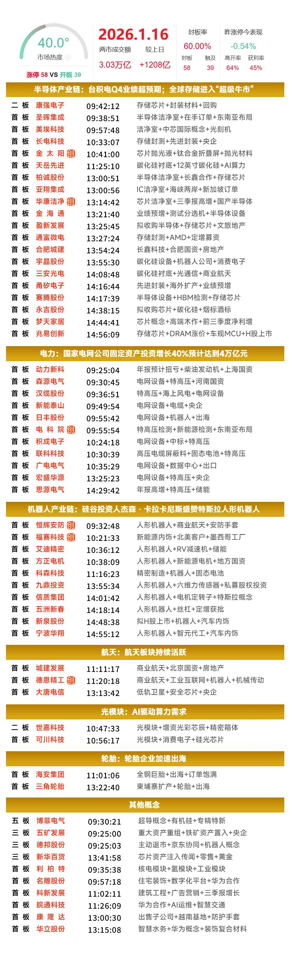 1月16日涨停复盘 | 半导体产业链集体走强,存储芯片概念午后持续拉升,电网设备