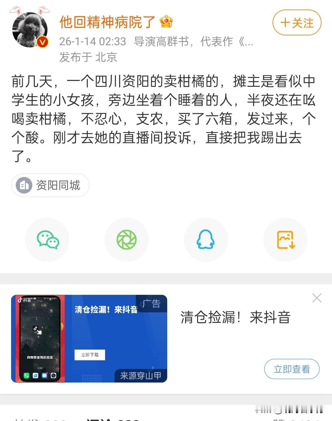 导演高群书半夜想助农,结果被套路了。网民总结:导演栽在了群演手里了——再递进一步:知名导演和社会群演之间的爱横情仇[偷笑][偷笑][偷笑]