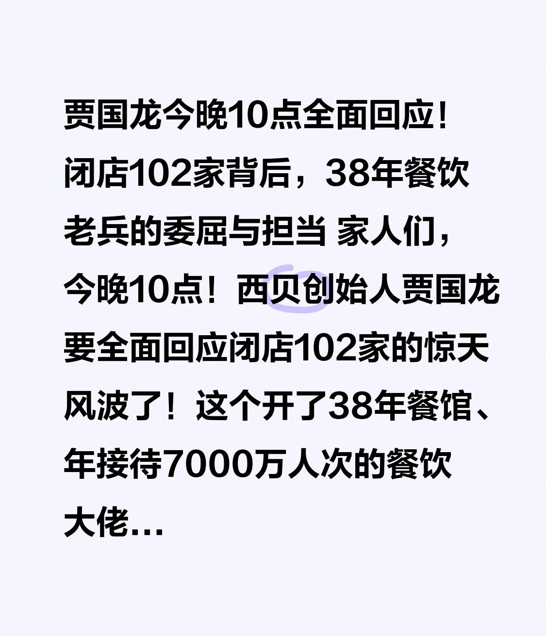 贾国龙今晚10点全面回应!闭店102家背后,38年餐饮老兵的委屈与担当 家人们,今晚10点!西贝创始人贾国龙要全面回应闭店102家的惊天风波了!这个开了38年餐馆、年接待7000万人次的餐饮大佬,一边说“向顾客认错”,一边喊“被污蔑125天”,到底是实干派遭了冤,还是没懂消费者真正要啥? 先给没跟上的朋友捋捋来龙去脉:从去年9月罗永浩炮轰西贝“高价卖预制菜”,到开放厨房直播反被扒出24个月保质期的冷冻西兰花,再到如今突然宣布关闭全国三成门店,涉及4000名员工失业,西贝这125天过得比坐过山车还刺激。 最让人看不懂的是贾国龙的态度大反转!去年12月还低头认错,说自己硬刚舆论太幼稚,忽视了顾客声音;今晚要回应的长文里却话锋一转,直言“不懂公关就该被欺辱吗”,甚至自曝家底——北京仅一套房,呼和浩特还在租房,无海外资产,誓要和西贝共存亡。 转折来了!就在大家以为他要彻底硬刚到底时,回应里藏着的担当却让人破防:离职员工工资一分不差,顾客储值卡随时能退,就连要闭店的门店,都要硬撑到做完年夜饭再关。一边是“被污蔑”的委屈呐喊,一边是“不辜负”的责任坚守,这波操作真的让人又争议又心疼。 其实这事的核心矛盾很简单:贾国龙说的“中央厨房备菜≠预制菜”,在消费者眼里就是“不是现做的都不算新鲜”;他觉得38年实业该被尊重,可大家吐槽的是近百元客单价没吃到对应价值。老乡鸡早就用行动证明,主动标注预制菜反而客流回升15%,透明才是餐饮业的生存底线。 今晚10点的全面回应,贾国龙会不会直面定价争议?会不会给消费者一个透明化的解决方案?其实不管是餐饮老板还是普通食客,我们想要的从来不是口水战,而是踏实做事的人被善待,花钱消费的人能放心。 你觉得贾国龙的委屈该被理解吗?西贝还能挺过这关吗?评论区聊聊你的看法,今晚10点一起蹲后续!