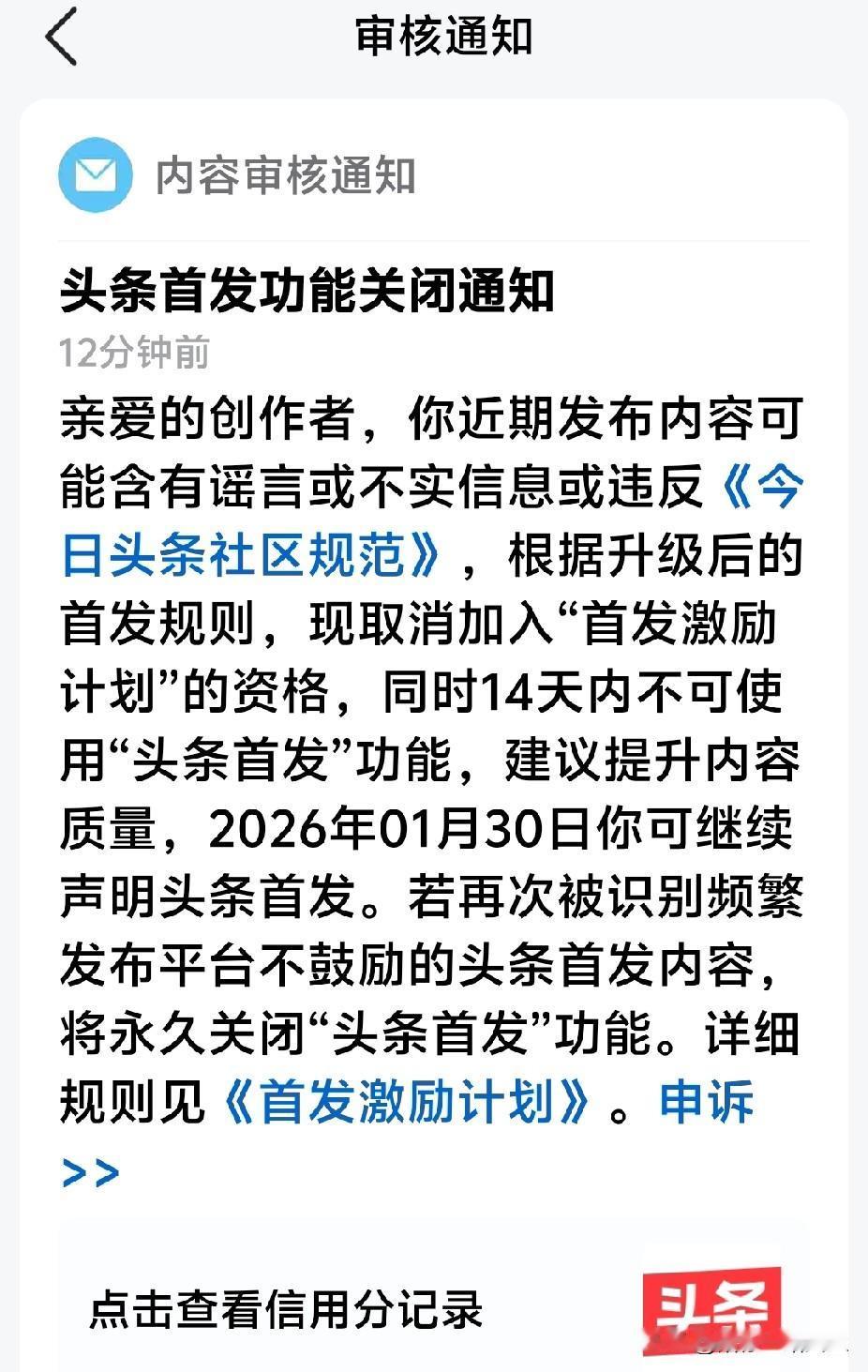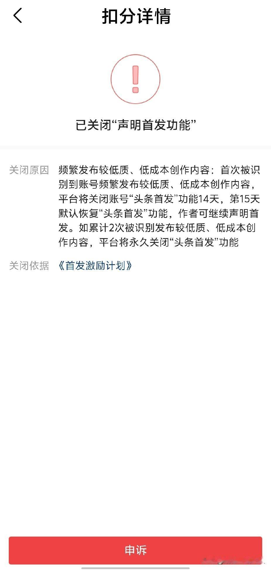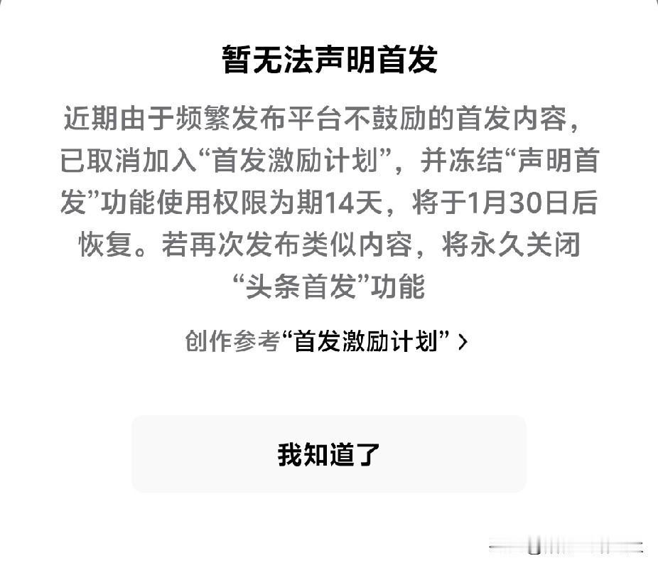 坏消息来了!我被取消首发激励计划14天,再有下次,将永久关闭“首发功能”。