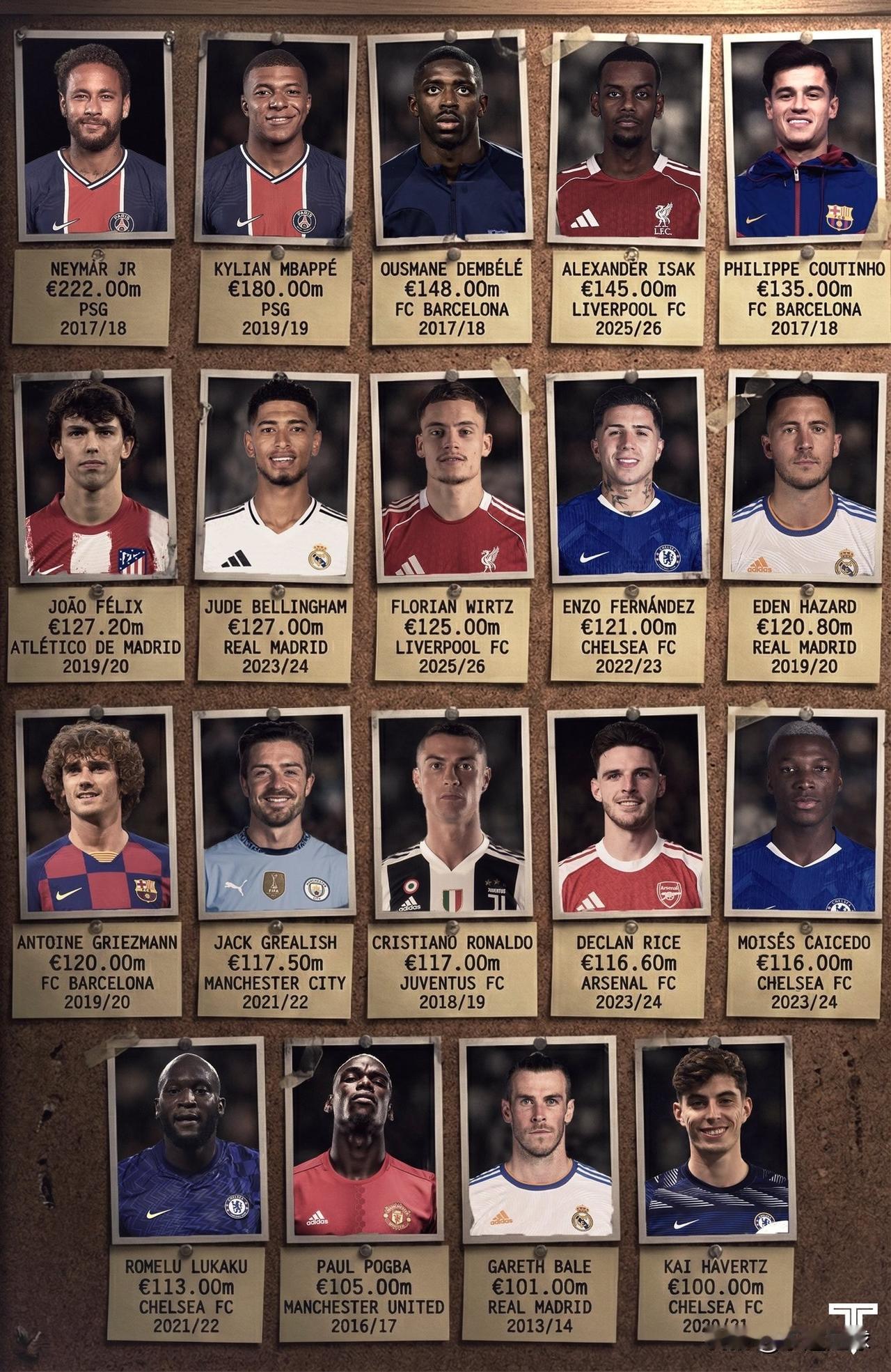 说出那些身价超过1亿€的球员的名字? - 内马尔:2017/18赛季以 €222.00m(2.22亿欧元)加盟PSG,是图中转会费最高的交易。 - 姆巴佩:2019/19赛季以 €180.00m(1.8亿欧元)加盟PSG。 - 登贝莱:2017/18赛季以 €148.00m(1.48亿欧元)加盟巴萨。 - 伊萨克:2025/26赛季以 €145.00m(1.45亿欧元)加盟利物浦。 - 库蒂尼奥:2017/18赛季以 €135.00m(1.35亿欧元)加盟巴萨。