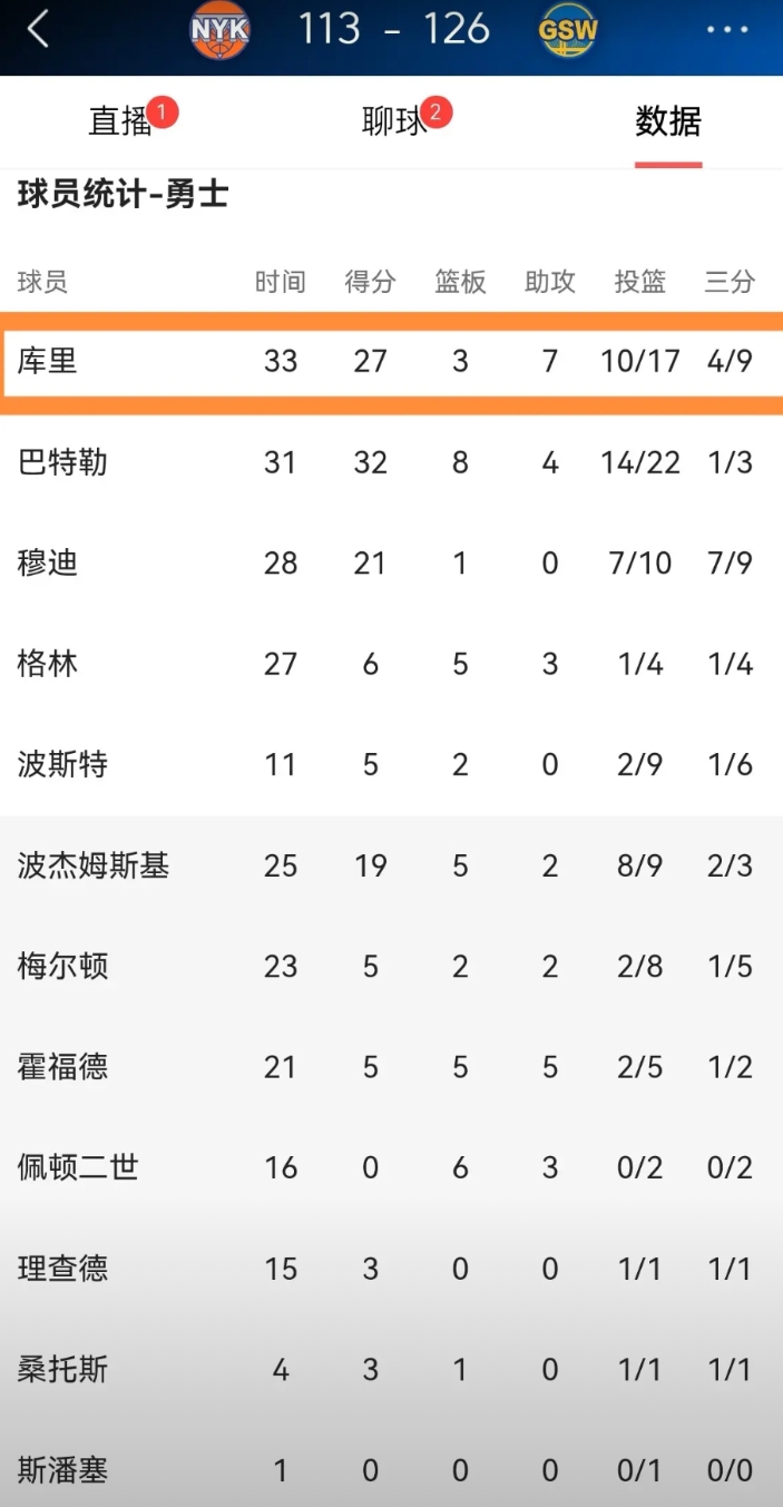 我又被勇士巨星库里狠狠地打脸了!在今天勇士主场以126:113击败尼克斯的比赛中,库里首发出战33分钟,投篮17中10,其中三分球9中4、罚球3中3非常高效的砍下27分3篮板7助攻1抢断1盖帽,他的场上正负值为+3。值得一提的是,库里在上半场比赛中三分球4中0,因此我忍不住怒喷库里,可惜的是最终库里却把我的脸打肿了。