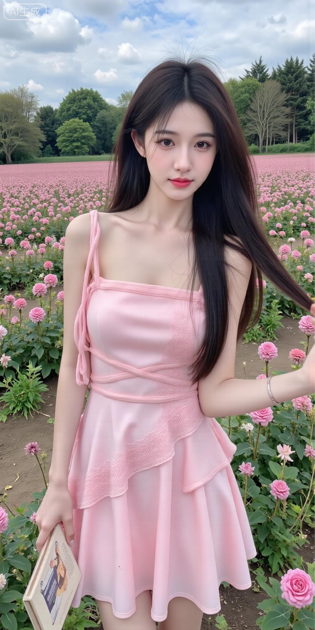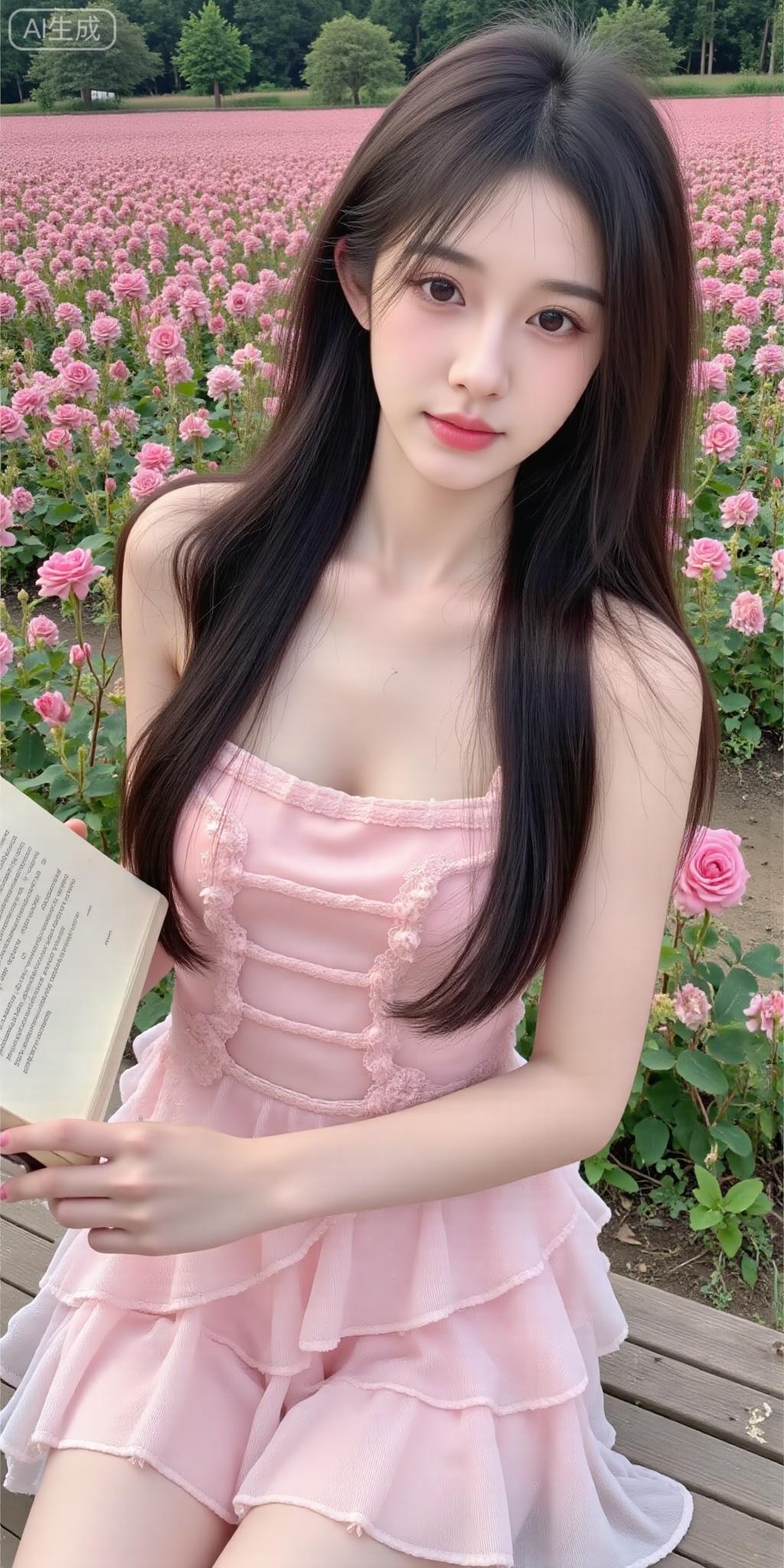 花田中的柔粉系少女 粉纱裙裹着软甜感,蕾丝细节戳中少女心~手捧书卷坐在花海里,连满屏粉玫瑰都成了她的温柔背景板✨ 是把“浪漫氛围感”焊在身上的妹妹!粉裙仙女