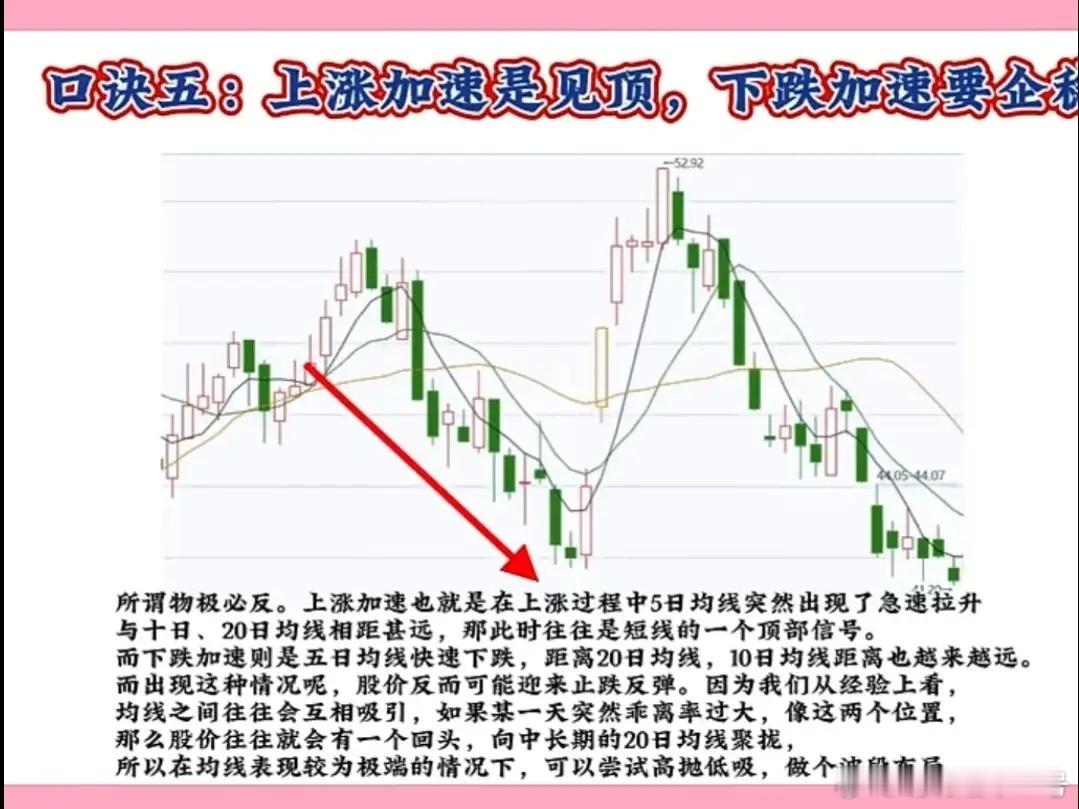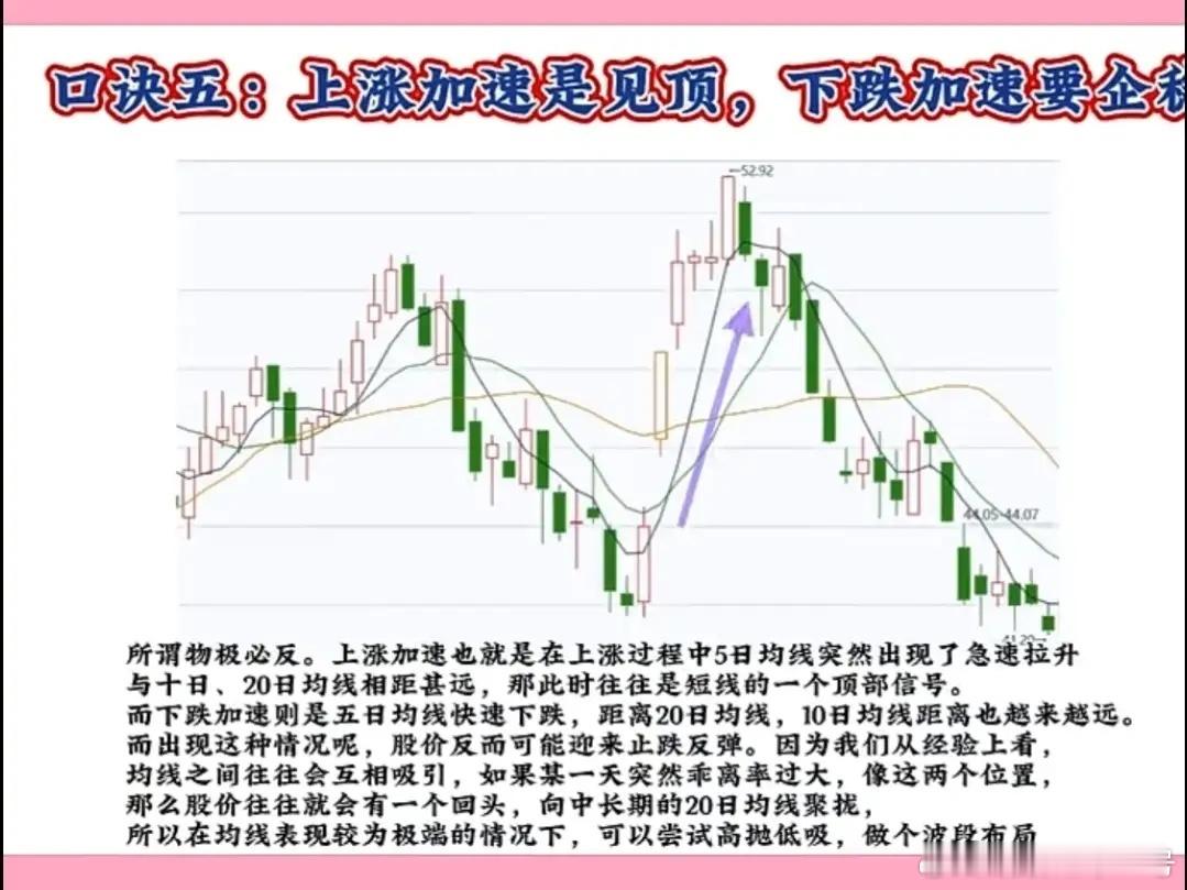 上涨加速要见顶,下跌加速要起稳这个口诀是趋势末端的反转预警信号,核心是“加速赶顶/赶底”后的动能衰竭,实战需结合量能、形态、指标二次确认,避免提前预判。 一、 上涨加速要见顶 1. 加速特征股价脱离原有上升斜率,短期连续大阳线拉升,甚至出现涨停潮,均线乖离率(股价与均线的偏离程度)快速扩大。2. 见顶确认信号量能:加速阶段放量滞涨(成交量放大但股价涨幅缩小/冲高回落),或天量阴线砸盘;形态:出现乌云盖顶、黄昏星、高位十字星等反转K线;指标:MACD顶背离(股价创新高,MACD红柱缩短/不创新高)、KDJ超买区死叉。3. 操作策略分批止盈,不追最后一段涨幅;若跌破5日线或加速启动的起涨点,果断清仓。 二、 下跌加速要企稳 1. 加速特征股价跌破原有下跌斜率,短期连续大阴线杀跌,甚至跌停潮,均线乖离率向下快速扩大。2. 企稳确认信号量能:加速阶段缩量急跌(抛压衰竭),或低位放量长阳(资金抄底);形态:出现曙光初现、早晨星、低位锤子线等反转K线;指标:MACD底背离(股价创新低,MACD绿柱缩短/不创新低)、KDJ超卖区金叉。3. 操作策略不急于抄底,等企稳信号(如缩量横盘、放量反弹突破短期均线);轻仓试错,止损设在加速下跌的最低点下方。 三、 实战口诀补充 上涨加速看滞涨,天量阴线快离场;下跌加速看缩量,放量长阳等企稳。