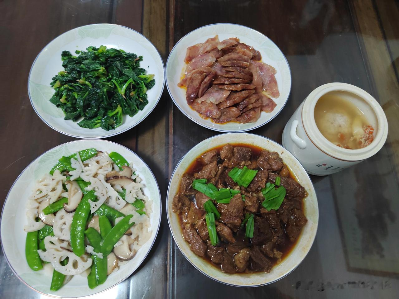 今天南京市气温回暖见顶,白天最高温度达到22℃,有轻度雾霾。 早上蒸香菇菜包、发糕、玉米、鸡蛋,还有南瓜麦片稀饭,小菜是花生米和萝卜干。 今天周五又到了碰友日,在支付宝又领到了碰一下红包,不过金额很小,只有0.94元,还是分三天使用。今天在菜市场买菜时碰一下抵扣了0.5元红包。 中午在家里吃青菜饭,把昨天晚上剩下的鱼头豆腐汤也放在里面,烧出来的菜饭特别好吃。 午后顶着暖阳到菜市场转一转,买了草莓(单价18元)、荷兰豆(单价11.8元)、藕(单价3元)、香菇(12.5元)、铁棍山药(单价6.8元)、梅条肉等,在菜市场看到自制的香肠不错,买了几根尝尝,香肠30元一斤。 晚餐用盅蒸了肉饼汤,汤里放了山药,电饭锅蒸饭时蒸了香肠,还有藕片炒荷兰豆,清炒菠菜,牛肉是前几天吃剩的。 退休了无所事事,一天围着三餐转,大家不要见笑!