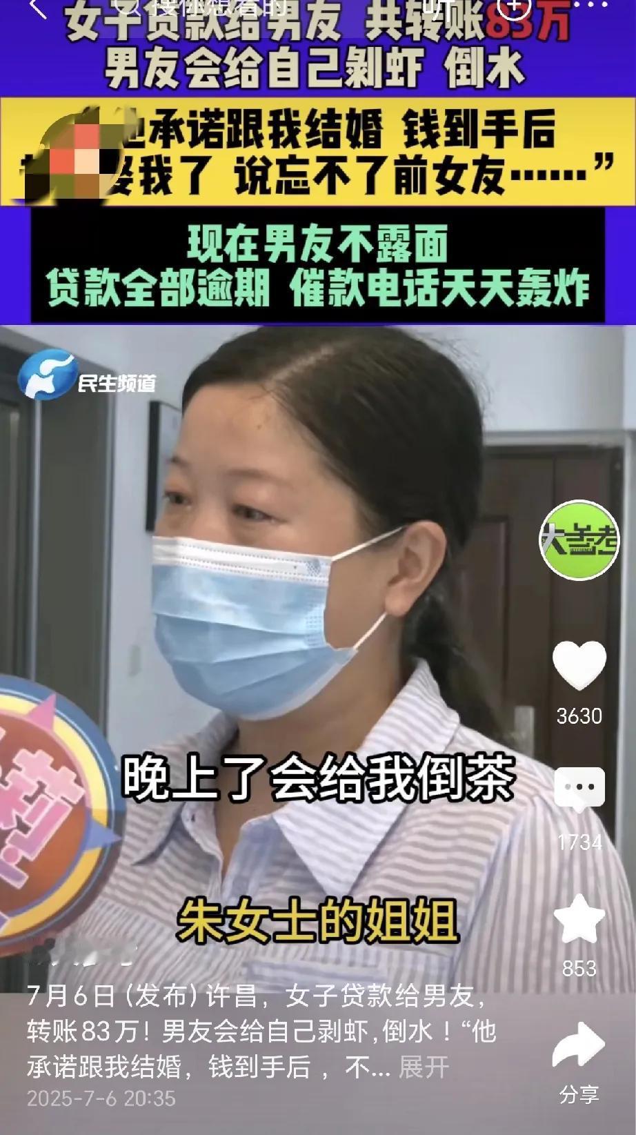太吓人了!河南许昌,一女子离婚,经人介绍,认识了男友,男友晚上给她端水,吃饭给她剥虾,然后问她借钱,女子卖了金首饰给他,男友说钱还不够,又说他母亲病了,女子又去网贷,贷款83万,全部转给了男友,男友拿到钱后跑了,说不能和她结婚,忘不了前女友,女子被人不停的催债,她找到男友家里,男友母亲才告诉她实情,女子一听,当场哭晕。 朱大姐的人生,算不上顺风顺水。第一段婚姻里,她掏心掏肺付出。对丈夫和婆家都尽心尽力,可换来的只有争吵。最后无奈离婚,独自承受着失败婚姻的伤痛。 离婚后的朱大姐,心里满是纠结。她渴望再有个家,能有个人托付余生。可又难免自卑,觉得自己二婚、相貌家世普通。能看上自己的人,恐怕没几个。 就在她最脆弱的时候,“真命天子”出现了。经人介绍,她认识了一个比自己小、样貌也周正的男人。这个男友,把温柔体贴做到了极致。饿了给做饭,渴了递温水,家务全包揽。出去吃龙虾,都会一个个剥好递到她手里。 长这么大,朱大姐从没被人这样疼过。这份突如其来的宠爱,让她彻底沦陷。她满心欢喜地投入这段感情,丝毫没察觉异常。却不知,所有的温柔都是有预谋的铺垫。 没过多久,男友开始愁眉苦脸。一副心事重重、快要哭出来的样子。朱大姐心疼不已,连忙追问缘由。男友支支吾吾半天,才哽咽着说母亲病重。急需用钱治疗,可自己手头根本不够。 一听是未来婆婆出事,朱大姐也慌了神。她当即拿出所有积蓄,又变卖了贴身的金首饰。把凑来的钱全塞给了男友,让他赶紧给母亲治病。 本以为这就是尽头,可贪婪的欲望没有底线。男友又一次次找借口,说医药费还不够。哄着朱大姐再想想办法,承诺以后一起还款。 被爱情冲昏头脑的朱大姐,彻底失去了理智。她竟用自己的身份信息,先后贷了83万。一分不少地,全都转给了男友。 拿到钱后的男友,态度瞬间变了。没过几天,就彻底失联了。电话不接,短信不回,像人间蒸发一样。 即便如此,朱大姐还在自我安慰。觉得男友是忙着照顾母亲,才没时间联系自己。直到催债电话接连不断地打来,她才彻底慌了。 83万的贷款,凭她一己之力根本还不上。当初男友承诺的共同还款、经营小家,全是谎言。走投无路的朱大姐,只能告诉家人实情。 家人一听就知道她被骗了,赶紧报警求助。为了尽快找到男友,他们还联系了记者帮忙。循着线索,大家找到了男友的家。 见到男友母亲后,真相才彻底浮出水面。老人家身体好好的,根本就没生病。提起这个儿子,老太太满是无奈和气愤。说他就是个混蛋,把亲戚朋友骗了个遍。早就六亲不认,她也联系不上人。 得知真相的那一刻,朱大姐眼前一黑。当场哭晕过去,醒来后只剩无尽的悔恨。她怎么也想不通,自己掏心掏肺对待的人。从头到尾都在算计自己,那些温柔全是演戏。 其实仔细想想,这场骗局早有破绽。一个刚认识不久的人,突然对你过度好。大概率不是真爱,而是另有所图。 尤其是涉及金钱时,更要保持清醒。不管是恋爱还是交友,都别轻易掏空自己。爱自己,守住底线,才是最重要的。 信源:(大参考 2025-7-6 女子贷款给男友共转账83万元,男友会给自己剥虾倒水)