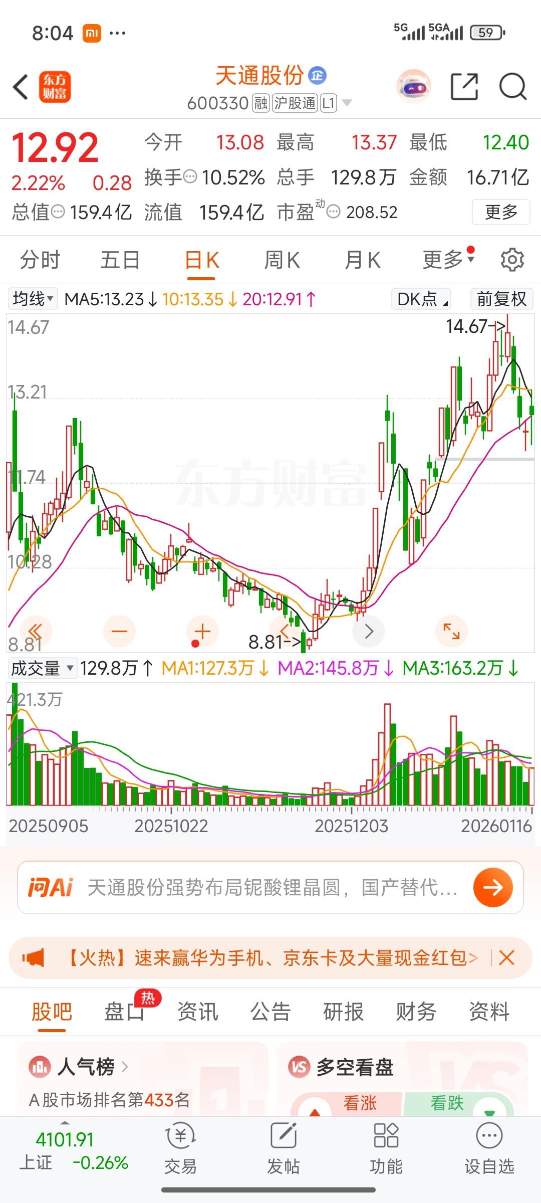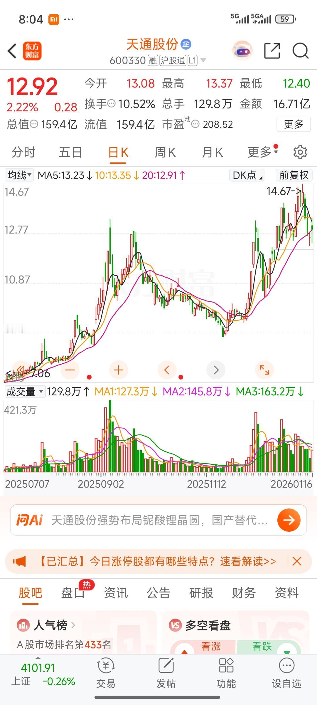 复盘手中持有的天通股份,天通股份集商业航空航天等多重概念于一身。在本轮商业行情上涨中,天通股份实则只是微涨,最多算小幅上扬,回调后目前也是小幅回调。 今日,天通股份一开始似有上拉之势,结果却既未反转,也未反弹,而是随板块回落。就目前情况而言,持有天通股份还是比较安全的。从长期来看,长期持有应能有所获益,所以暂时不考虑减仓。 股友们,你们在这次商业航天行情获利如何?对我来说,这次商业航天几乎没怎么盈利,最多是微利,错过了上一轮轰轰烈烈的商业航天浪潮,实在可惜。希望在商业航天回调到位、沉寂一段时间后的第二轮上涨行情中,我能好好把握。而这就要靠天通股份为我出力了。 航天发展股票 商业航天低价股 航天航空股票 天普股份 天普股份龙虎榜 天地板股票 航空天板块