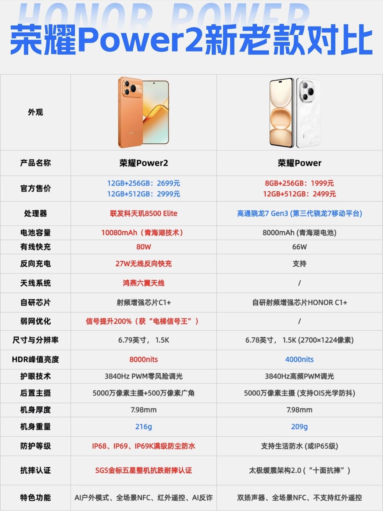 荣耀真是把牙膏都挤爆了!荣耀Power2相比上代的升级可以说是“脱胎换骨”了。 从具体的升级来看,处理器升级为性能更强劲的天玑8500E,电池更是破天荒的突破了1万毫安时,充电功率也更高,再加上防护等级和抗摔性能。在它面前上代真的完全不够看了。所以说荣耀Power2价格上调也在情理之中。