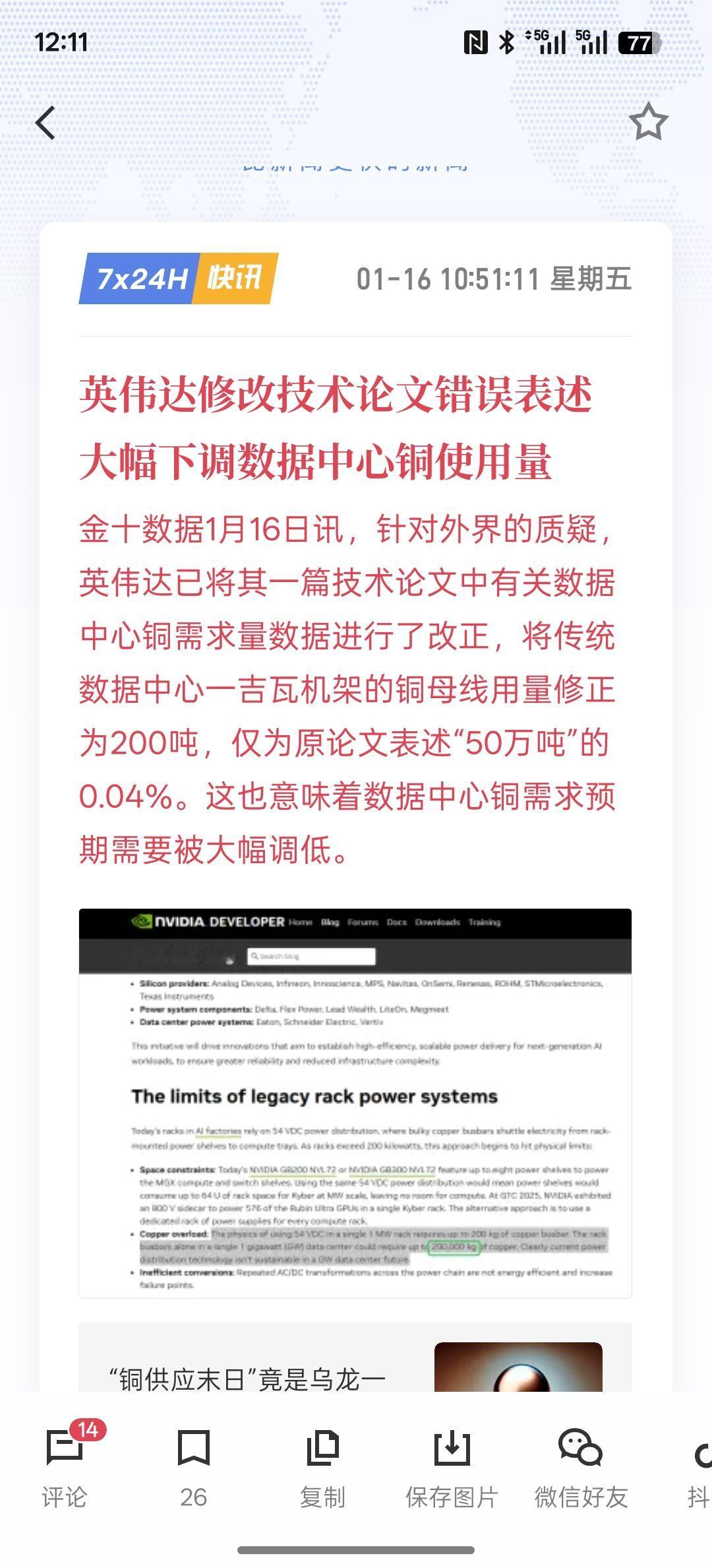 这是利空消息,英伟达修改技术论文错误表述 大幅下调数据中心铜使用量,关于铜价大幅上涨!现在铜价涨的太高,价格太贵,直接修改数据可以让铜价做空,铜价掉下去,有利于这些企业减少铜价成本的开支!近这些贵重金属的价格不断上涨,对于这些企业需求量越大,成本就越高!现在贵重金属的期货市场,已经被炒的太高!比如白银的价格,目前一直在持续上涨!白银可是工业需求重要的资源!芯片,汽车都需要白银! 而对于当前这个数据修改,铜价可能会有所回调,但有机构预测,随着AI人工智能发展以及新能源汽车的发展,对铜的需求依然还有很大的前景,铜价依然会让市场继续繁荣!