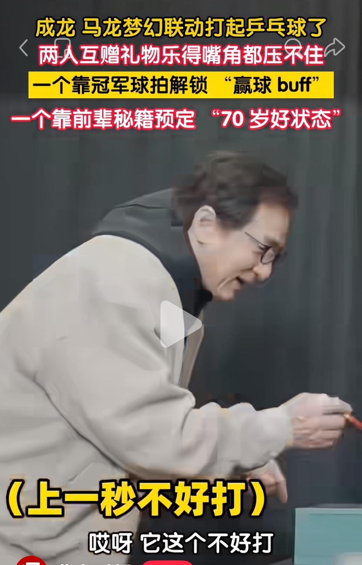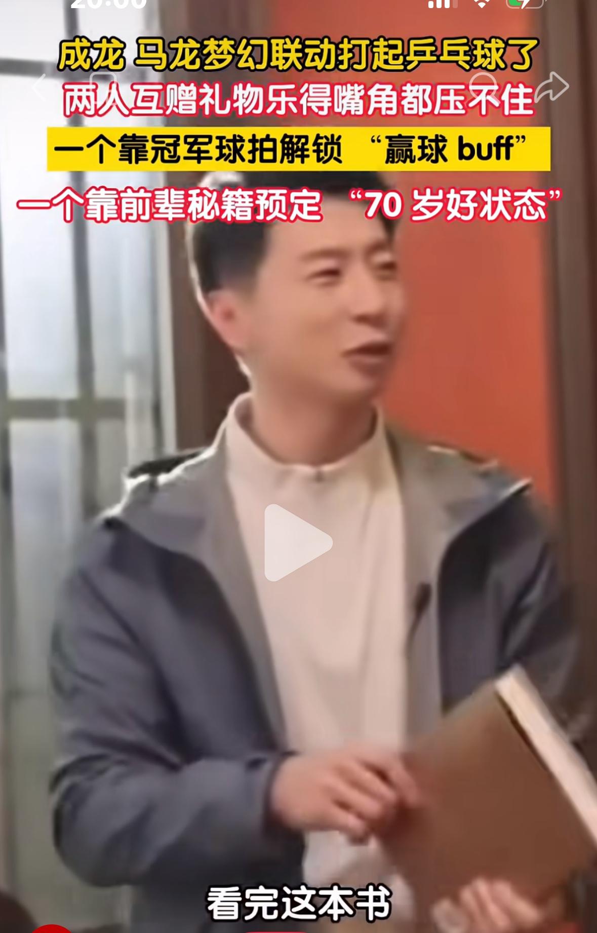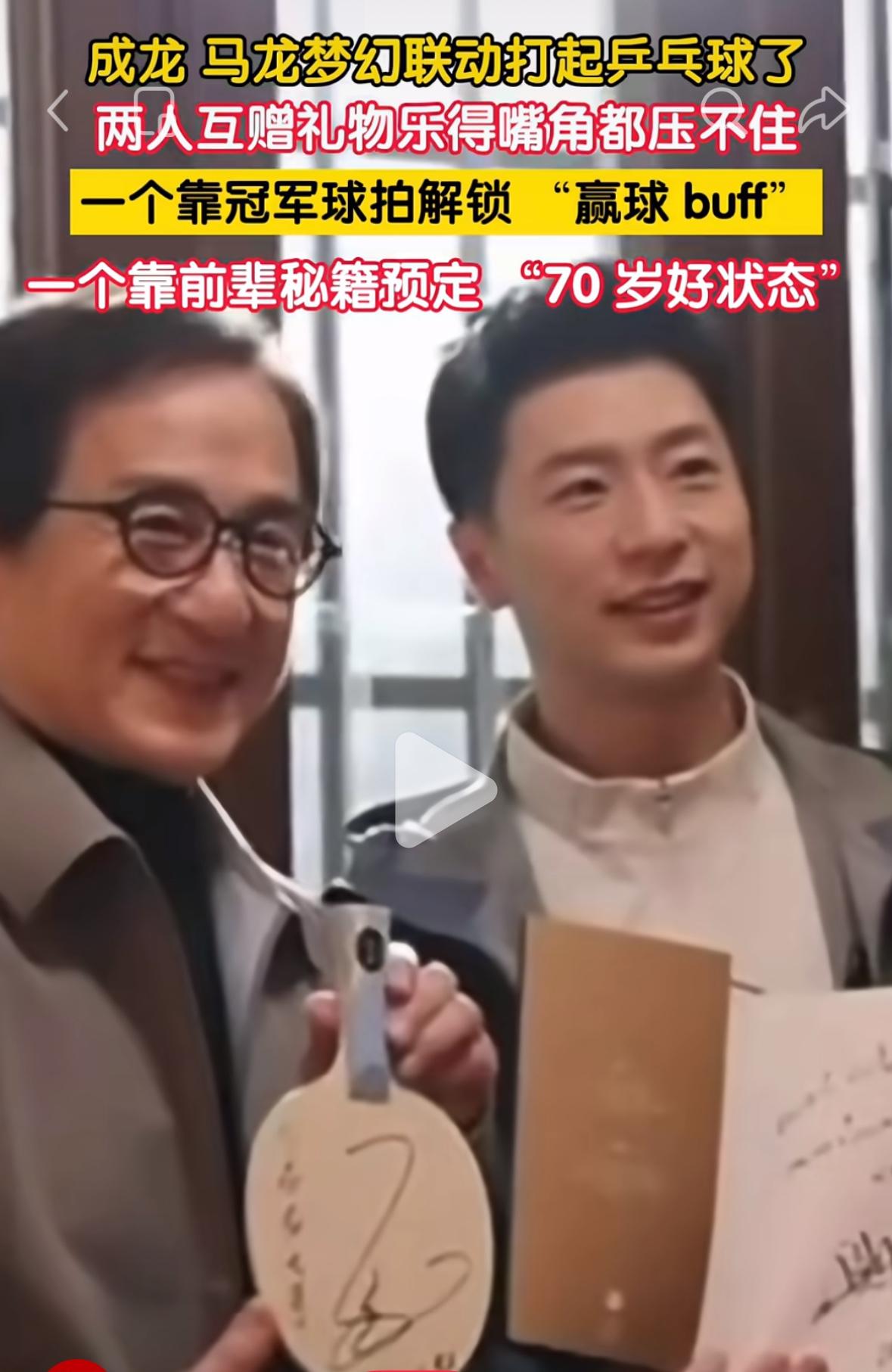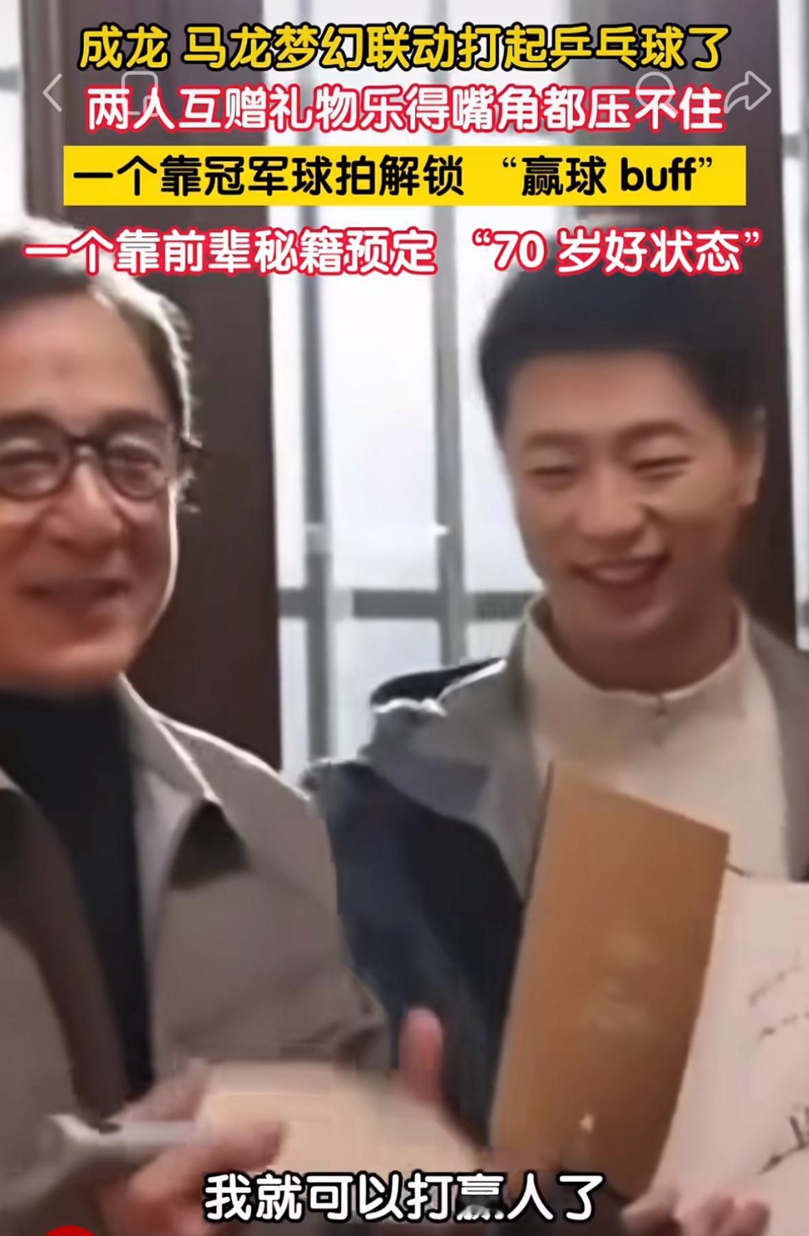 成龙和马龙梦幻联动打乒乓球🏓——两个人互赠礼物惺惺相惜 成龙和马龙的互动很开心, 成龙收到马龙赠送的球拍, 开心的表示,我拿到这个板可以 打人啦! 马龙收到成龙送的一本书, 开心的说 “我看了这本书之后, 到了70岁也可以有这么好的状态!” 梦幻联动, 两个名人互赠礼物, 嘴角都压不住啦! 一个龙叔,一个龙哥, 双龙合并,马到成功! 两个都是中国龙, 两个领域的大佬级人物! 成龙可以啊, 也会打乒乓球🏓, 马力全开的马龙, 期待时装周,马力的新造型!