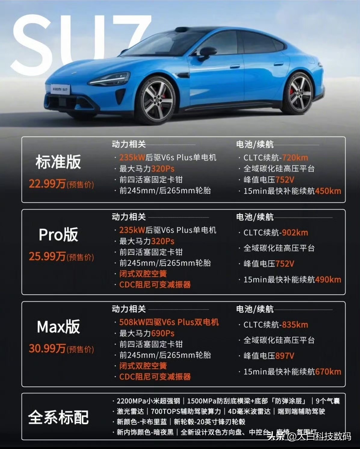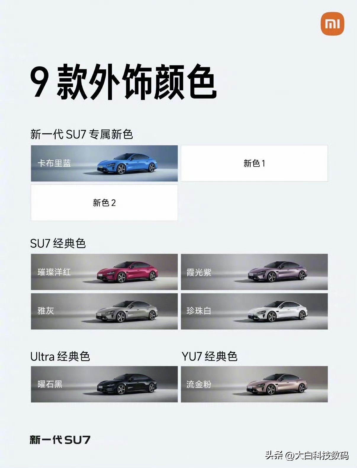 新一代小米SU7九款颜色公布新一代小米SU7太懂拿捏年轻人喜好了!9款颜色提前剧透,7款已亮相,卡布里蓝自带光影质感拉满~还有曜石黑、璀璨洋红等经典款坐镇,2款隐藏色超让人期待! 全系升级800V平台,续航、智驾、安全拉满,预计4月发布上市就!话说,大家更喜欢哪个颜色呢?