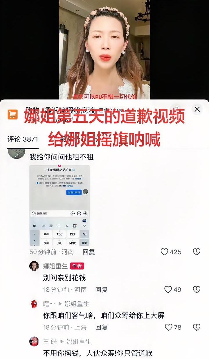 娜姐道歉第五天,网友准备众筹租赁万达广场大屏幕,专门播放道歉视频。 据说她老公所在公司股票都降了7个点、第五天的道歉视频被平台下架两次。 可以说这道歉视频是威力十足,网友们从没这么期待过哪个博主更新视频。 网友喊话:“别客气,你只管道歉,剩下的交给我们”。