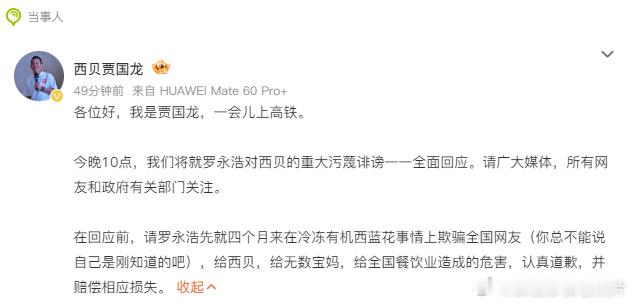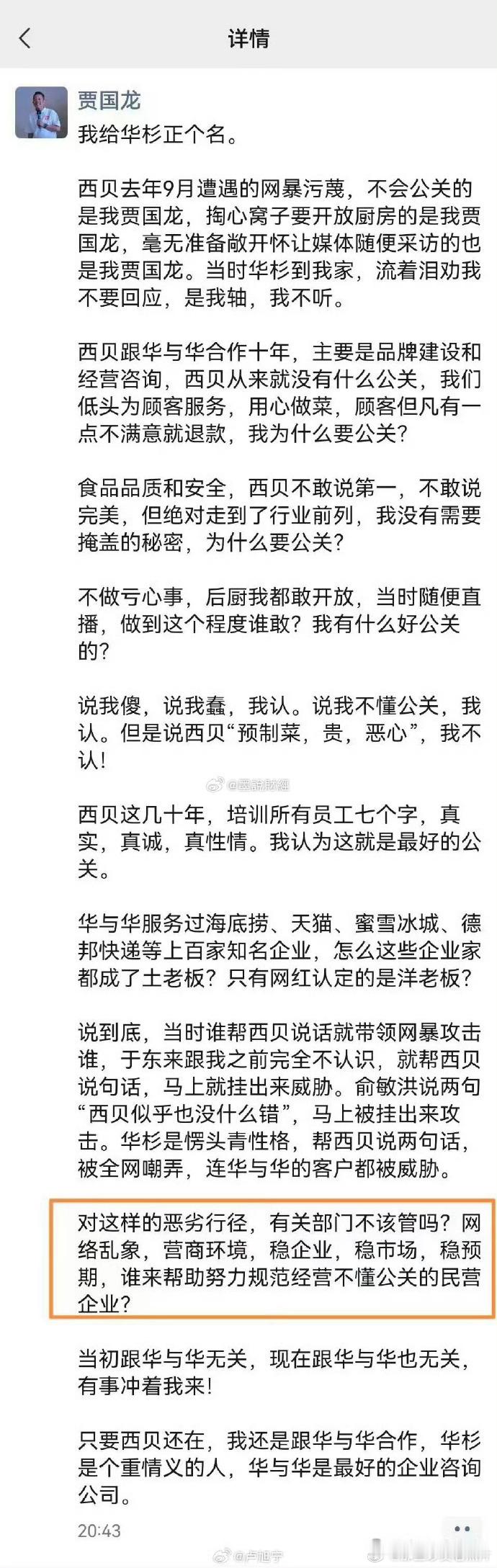 西贝风波后续贾国龙今晚10点全面回应 贾国龙性格确实相当固执,好多人都快忘了这事了,贾国龙这现在又出来捅自己几刀,这是怕西贝倒闭的慢呀。