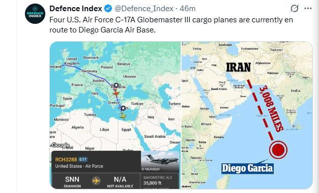 目前有四架美国空军C-17A“全球霸王”运输机正在前往迭戈加西亚空军基地的途中。