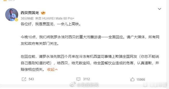 贾国龙说罗永浩重大污蔑诽谤西贝创始人贾国龙今日突然喊话罗永浩,指责其长期“污蔑诽谤”西贝,要求对方就“冷冻有机西兰花事件”道歉赔偿,并宣布将于今晚10点全面公开回应争议,将一场持续四个月的预制菜舆论战推向高潮。