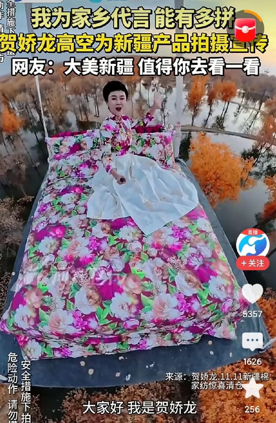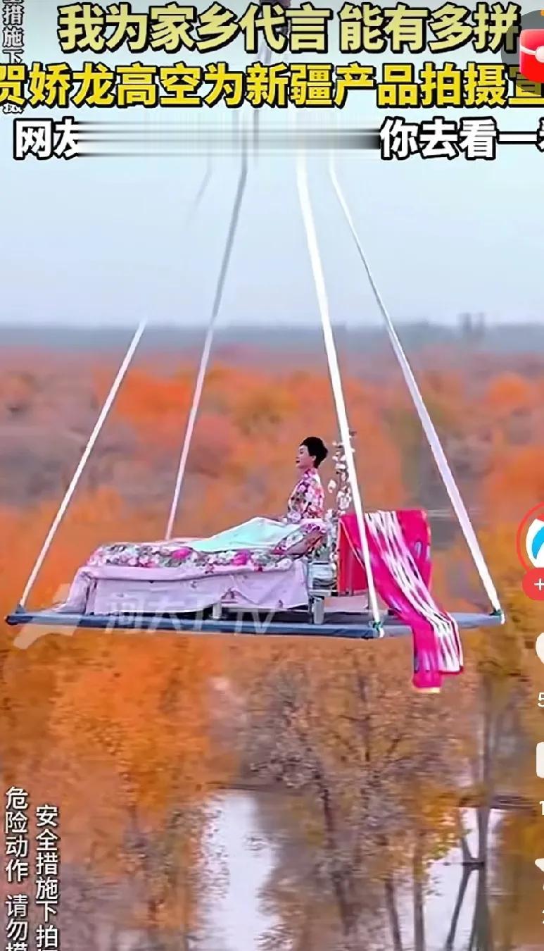 贺娇龙不愧是女中豪杰,为了宣传也是豁出去了。 有没有发现,她的每次宣传,拍摄的视频都是精彩万分,并且都是让人倒吸一口凉气。有时候不是没有想到,这种高难度的拍摄都是谁想出来的。 在宣传胡杨林的时候,视频中更是坐在一张花色的床上,身上也是穿着同样的服装,下面就是美丽的胡杨林。 这可是在胡杨林的上百米的高空,估计一阵风吹过,都会晃动的很严重。 即便是做了一些安全措施,但是仍然是危险重重。所以说她每次的宣传都是让人胆战心情。