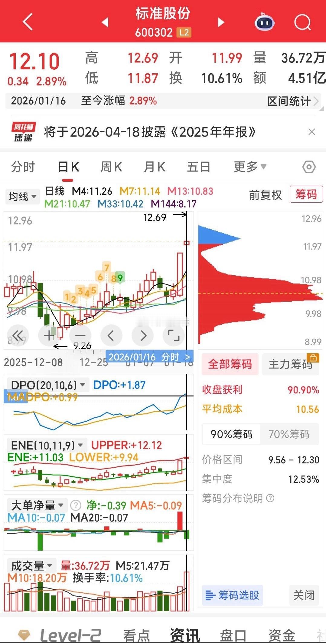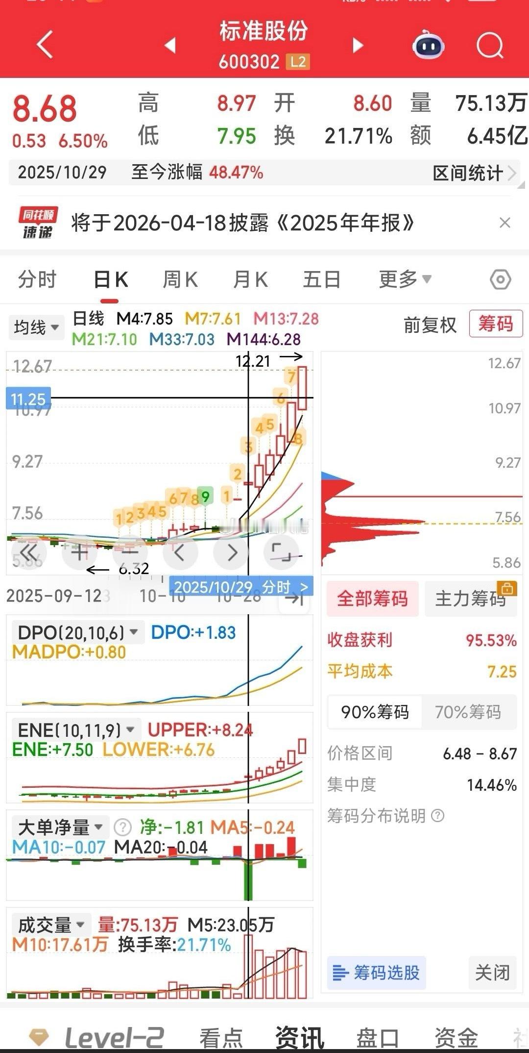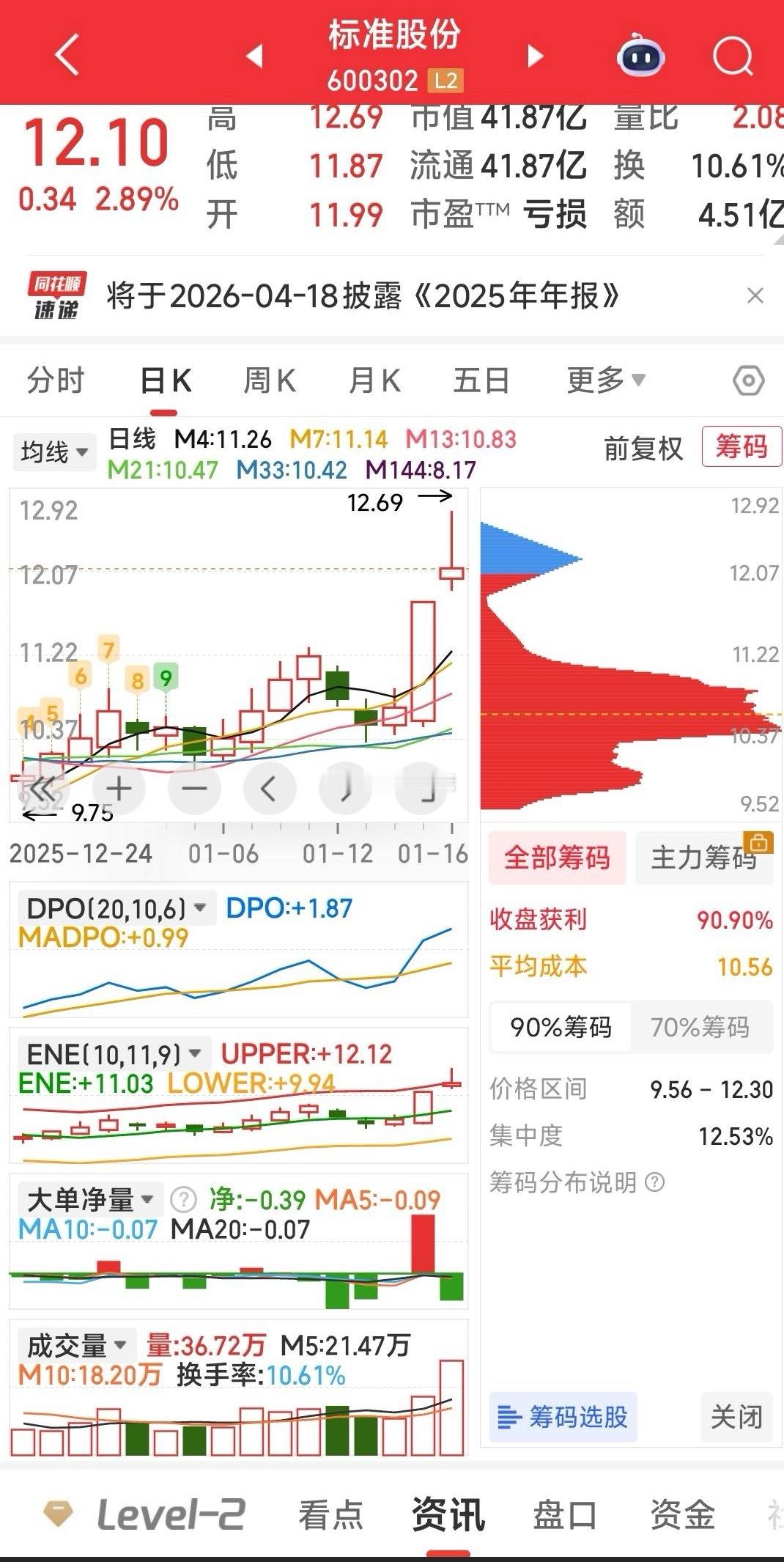 【标准股份,历史重现】请打开标准股份10月29日的K线和今天1月16的K线。再看看对应的技术指标:①筹码分布一样。②成交量一样放量。③主力净流入方式一样。④DPO金叉向上一样。⑤ENE上轨道运行一样。⑥涨停后收带上下影线的上升红十字星。共6个一样。前10月29日后连涨5天,那今天1月16日后会不会连涨5天呢?铁铁们,周未想一想吧。开心总比不开心好,那怕只是预想。