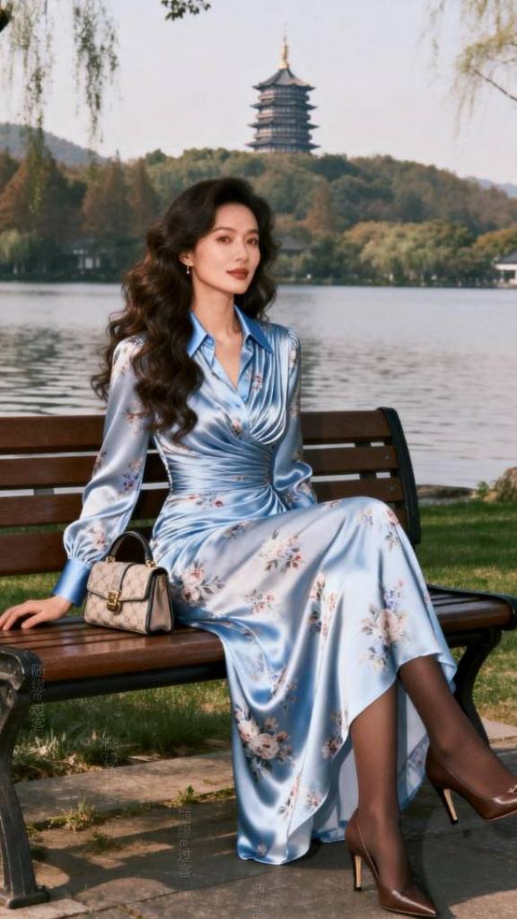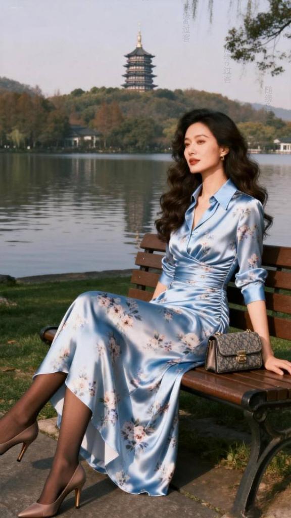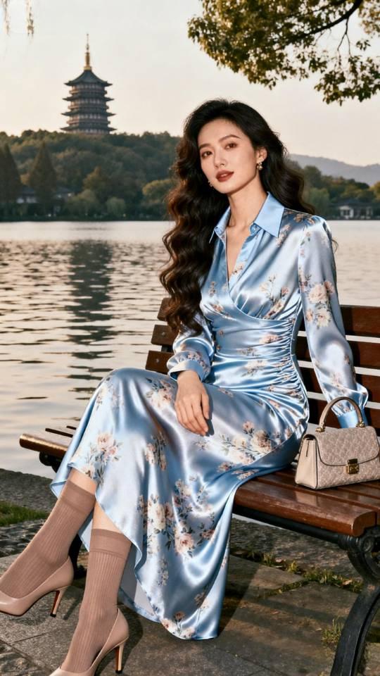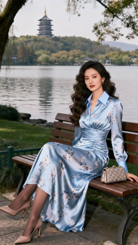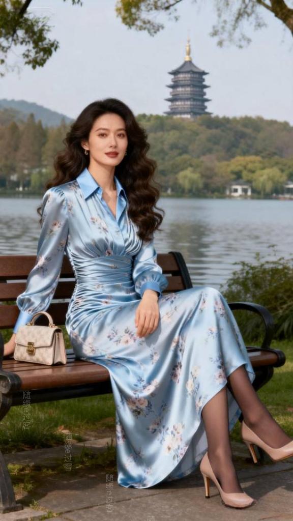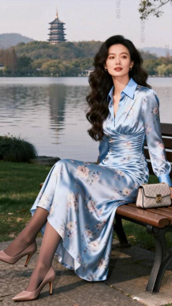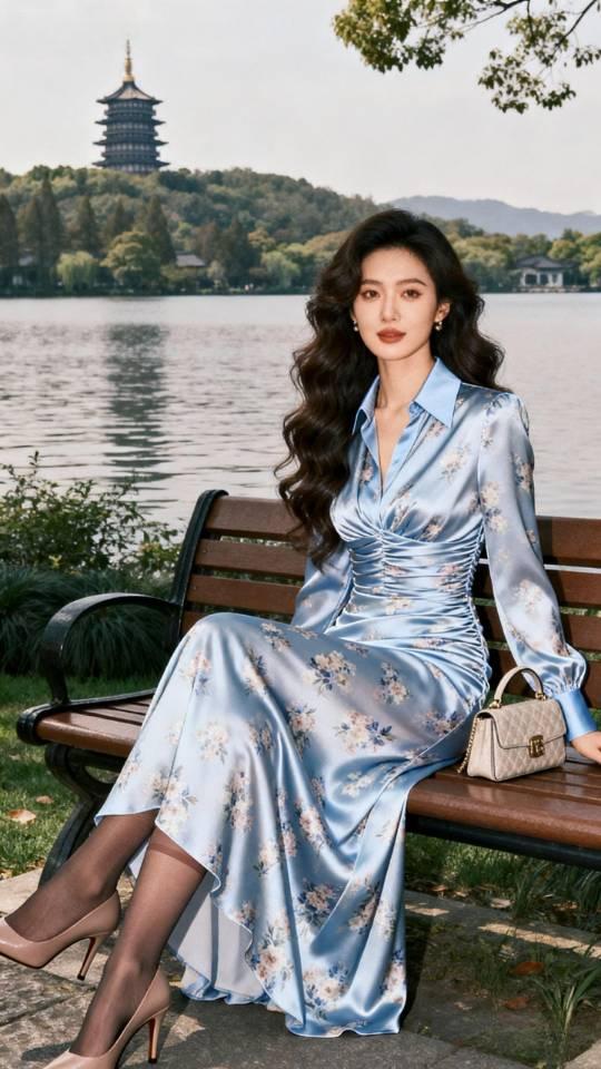 身穿浅蓝色花连衣裙西湖女游客。连衣裙 美女壁纸
