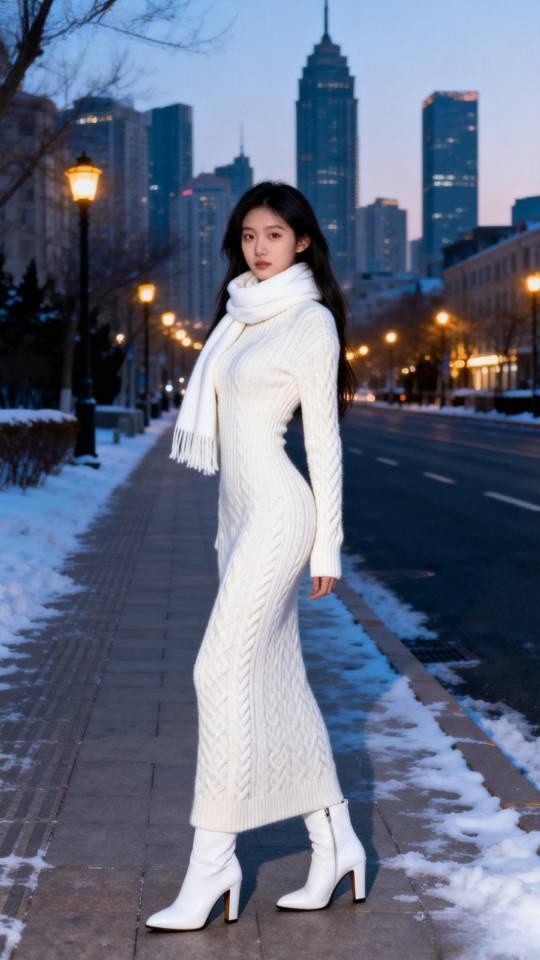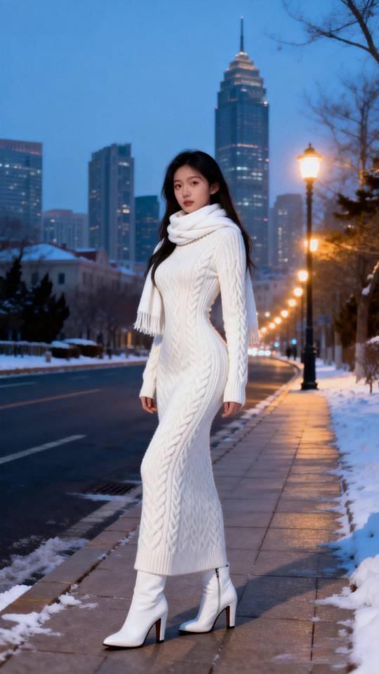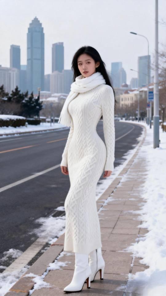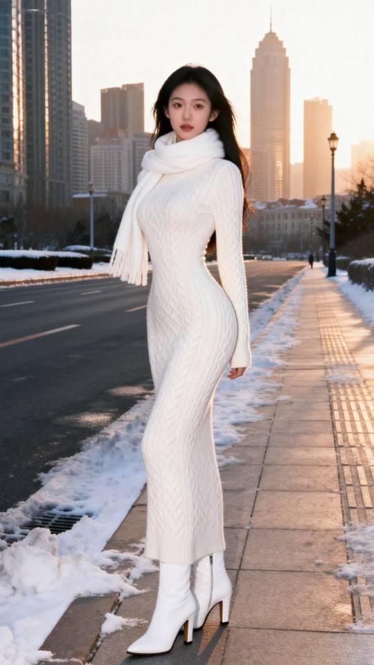 冬日雪景中的时尚穿搭,白色毛衣长裙搭配高跟靴,尽显优雅气质!毛衣裙 衣服穿搭