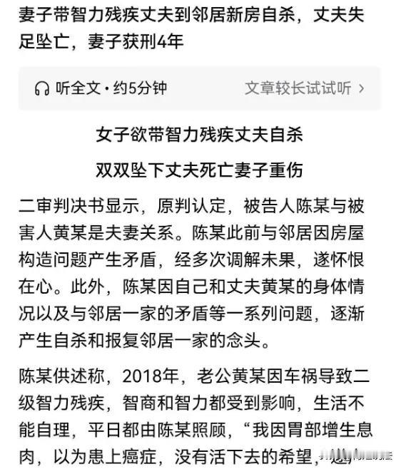 “我要死,也要死在她家新房里”:广东女子因长期邻里积怨,欲携智障丈夫自杀报复,一句话撕开底层社会最痛裂痕 广东佛山,一栋刚落成的四层小楼前,一名中年女子拉着坐在轮椅上的丈夫,翻墙闯入邻居家中,哭喊着要“死在这里”。 这不是闹剧,而是一场濒临崩溃的灵魂自毁。 女子姓陈,与邻居多年因宅基地、排水、建房等问题积怨极深,多次争吵未果,心中早已埋下恨意。更雪上加霜的是——丈夫一场车祸后被鉴定为二级智力障碍,生活无法自理;她自己体检又查出胃部有息肉,误以为是癌症晚期,“觉得活着没盼头了”。 而就在这时,她看到邻居热热闹闹地建起了新楼,贴瓷砖、办酒席、鞭炮齐鸣—— 别人在庆生,她在等死。 一个极端念头浮现:“反正我也活不下去了,不如和丈夫一起死在她家新房里,让这家人一辈子不得安宁!” 她真的这么做了。带着丈夫翻院墙、进屋、摆遗照、写遗书,准备烧炭自杀。幸被村民及时发现报警,才避免悲剧发生。 可我们骂她“恶毒”时,有没有想过:她是怎么一步步被逼到这一步的? 她不是天生偏执,而是一个普通农村妇女,在多重打击下彻底失去了对生活的掌控感:丈夫残了,自己病了,家败了,连最后一点尊严都在日复一日的争斗中磨光了。 她想求关注吗?想。 但她打110没人管,找村干部说“你们调解不了”,医院告诉她“息肉可切”,可没人问一句:“你心里的结,谁来解?” 这起未遂事件背后,藏着三个被忽视的真相: 第一,邻里矛盾从来不是“鸡毛蒜皮”。 在中国乡村,一砖一瓦都关乎脸面与生存,处理不好,就是血案前兆。 第二,精神危机从不只属于“疯子”。 她是病人,也是受害者,却被当成“麻烦精”被社会系统悄然抛弃。 第三,当一个人觉得自己“已死”,她就不怕制造死亡。 她不是想杀人,而是想用“同归于尽”的方式,让世界回头看她一眼。 最后想说:我们庆幸悲剧没发生, 但不能因此就抹去她的痛苦。 真正的文明,不是阻止人死在别人家里,而是不让任何人走到“只想死给别人看”的绝境。 如果是你,你会怎么处理这种“解不开的邻里仇”? 冷处理?以牙还牙?还是寻求第三方介入?评论区说出你的经历,也许能救下一个正在崩溃的人。 轻生自杀