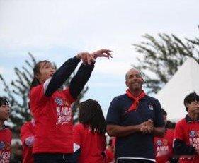 【“NBA关怀行动”走进北京台京学校】10月14日,为支持教育事业和关怀打工子弟的成长,NBA金州勇士队将“NBA关怀行动”带进北京市台京学校,为孩子们捐赠“阅读与学习中心”并进行了校园篮球活动。图为勇士队斯蒂芬·库里(前右)向台京学校的学生讲授运球技巧。