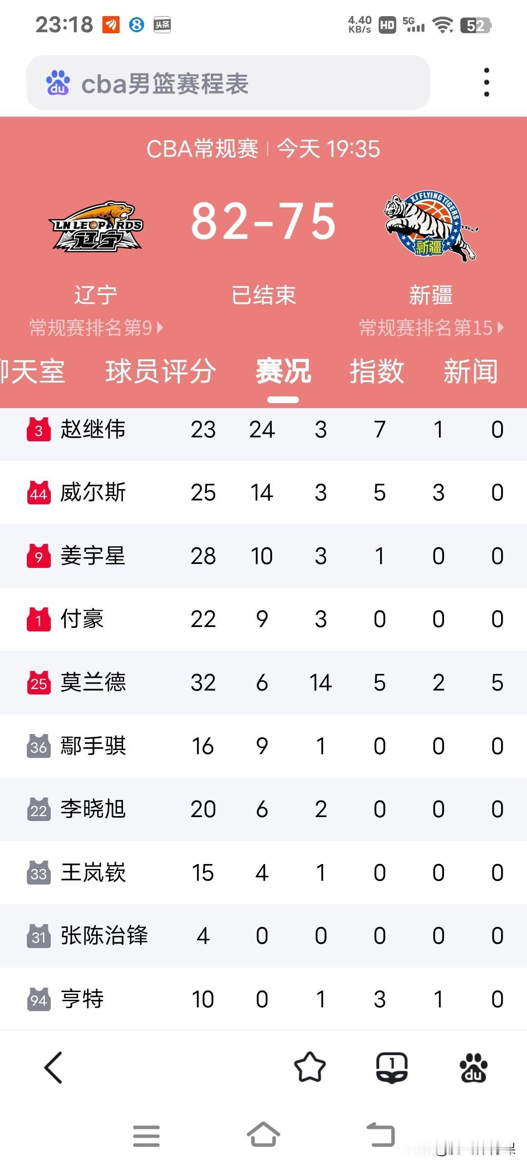 辽宁主场82:75击败新疆结束连败,赛后传来两喜一忧消息: 一.两喜一忧 1.球队战术核心赵继伟复出给球队带来绝对赢球的底气,赵继伟复出第一场比赛就轻松贡献24分3篮板7次助攻1次抢断,辽宁队最薄弱的组织后卫环节终于回归正轨。 2.赵继伟复出的复出唤醒莫兰德的状态,上赛季莫兰德与徐杰挡拆战术非常成功,如今赵继伟回归,莫兰德终于又回到一,五号位挡拆战术,本场比赛莫兰德贡献6分14篮板5次助攻2次抢断5次盖帽全面数据,熟悉的味道又回来了。 二:一忧 新签约的外援亨特三场比赛场均出场15.8分钟,场均贡献7.5分3.0篮板,今晚对阵新疆,出战10分钟,一分未得仅抢1个篮板和送出3次助攻,亨特的个人能力全面输给布朗,辽宁队这次换外援的次数可能就浪费掉了,不出意外,亨特可能不到满月就会被裁掉。