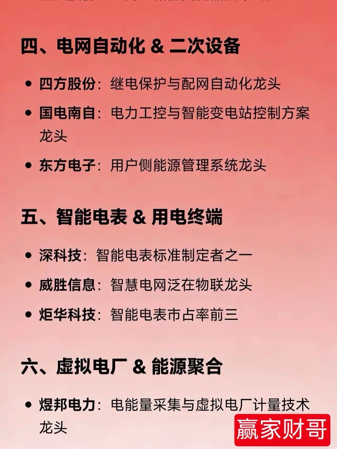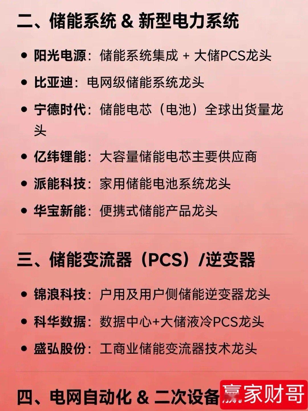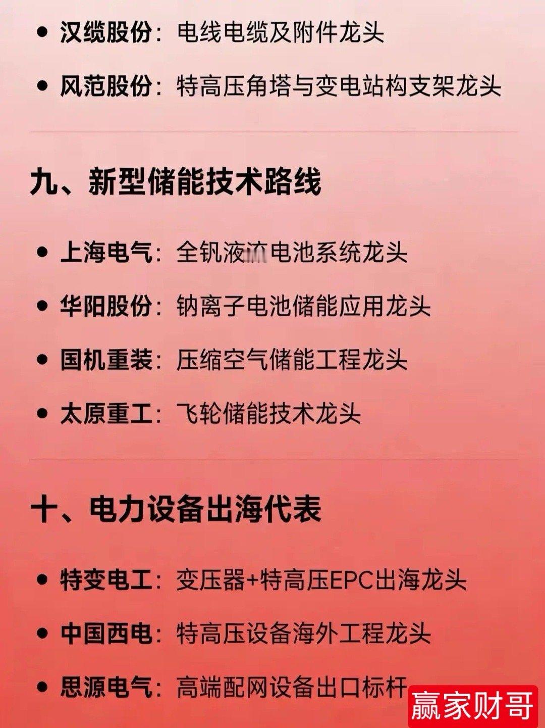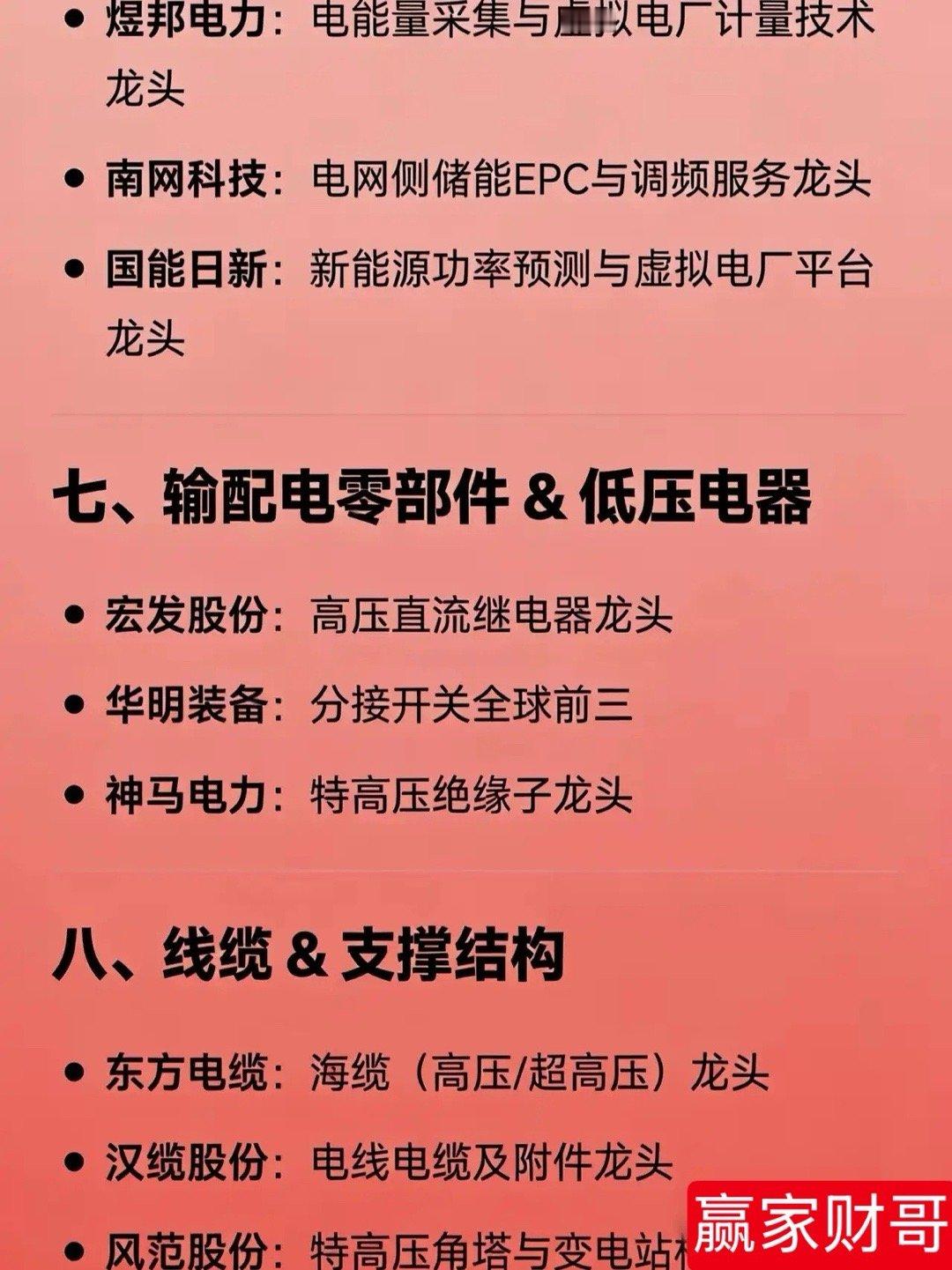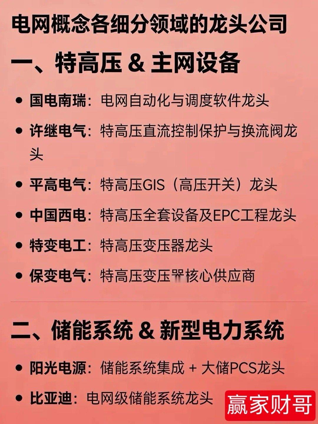 电网概念各细分领域的龙头公司一、特高压 & 主网设备国电南瑞:电网自动化与调度软件龙头许继电气:特高压直流控制保护与换流阀龙头平高电气:特高压GIS(高压开关)龙头中国西电:特高压全套设备及EPC工程龙头特变电工:特高压变压器龙头保变电气:特高压变压器核心供应商二、储能系统 & 新型电力系统阳光电源:储能系统集成 + 大储PCS龙头比亚迪:电网级储能系统龙头宁德时代:储能电芯(电池)全球出货量龙头亿纬锂能:大容量储能电芯主要供应商派能科技:家用储能电池系统龙头华宝新能:便携式储能产品龙头三、储能变流器(PCS)/逆变器锦浪科技:户用及用户侧储能逆变器龙头科华数据:数据中心+大储液冷PCS龙头盛弘股份:工商业储能变流器技术龙头四、电网自动化 & 二次设备四方股份:继电保护与配网自动化龙头国电南自:电力工控与智能变电站控制方案龙头东方电子:用户侧能源管理系统龙头五、智能电表 & 用电终端深科技:智能电表标准制定者之一威胜信息:智慧电网泛在物联龙头炬华科技:智能电表市占率前三六、虚拟电厂 & 能源聚合煜邦电力:电能量采集与虚拟电厂计量技术龙头南网科技:电网侧储能EPC与调频服务龙头国能日新:新能源功率预测与虚拟电厂平台龙头七、输配电零部件 & 低压电器宏发股份:高压直流继电器龙头华明装备:分接开关全球前三神马电力:特高压绝缘子龙头八、线缆 & 支撑结构东方电缆:海缆(高压/超高压)龙头汉缆股份:电线电缆及附件龙头风范股份:特高压角塔与变电站构支架龙头九、新型储能技术路线上海电气:全钒液流电池系统龙头华阳股份:钠离子电池储能应用龙头国机重装:压缩空气储能工程龙头太原重工:飞轮储能技术龙头十、电力设备出海代表特变电工:变压器+特高压EPC出海龙头中国西电:特高压设备海外工程龙头思源电气:高端配网设备出口标杆