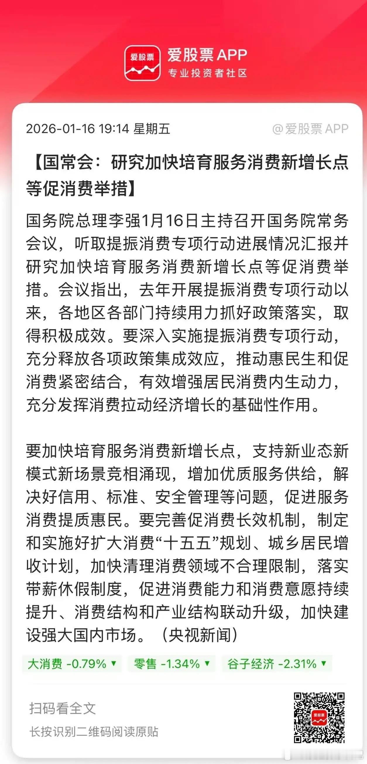 国常会再抛消费利好!这个板块却走出最惨剧本国常会加码消费利好,内需提振已是近年政策核心,更是今年头号任务。其中服务消费被重点提及,但政策落地效果始终没跟上。消费板块直接走出“跟跌不跟涨”的尴尬行情,其他板块涨它纹丝不动,大盘调整它领跌向下。后台快被问爆了:白酒要不要割肉?实在扛不住了!从A股的极端尿性来看,或许真要等最坚定的白酒信仰者离场,这个方向才算彻底见底。消费股数据虽弱,但也没到不堪一击的地步。要知道A股不是美股,10-20年内难出“漂亮七姐妹”那样的巨头。只靠制造业上游+科技撑不起牛市,消费+顺周期的托底,才是A股走牛的关键逻辑。