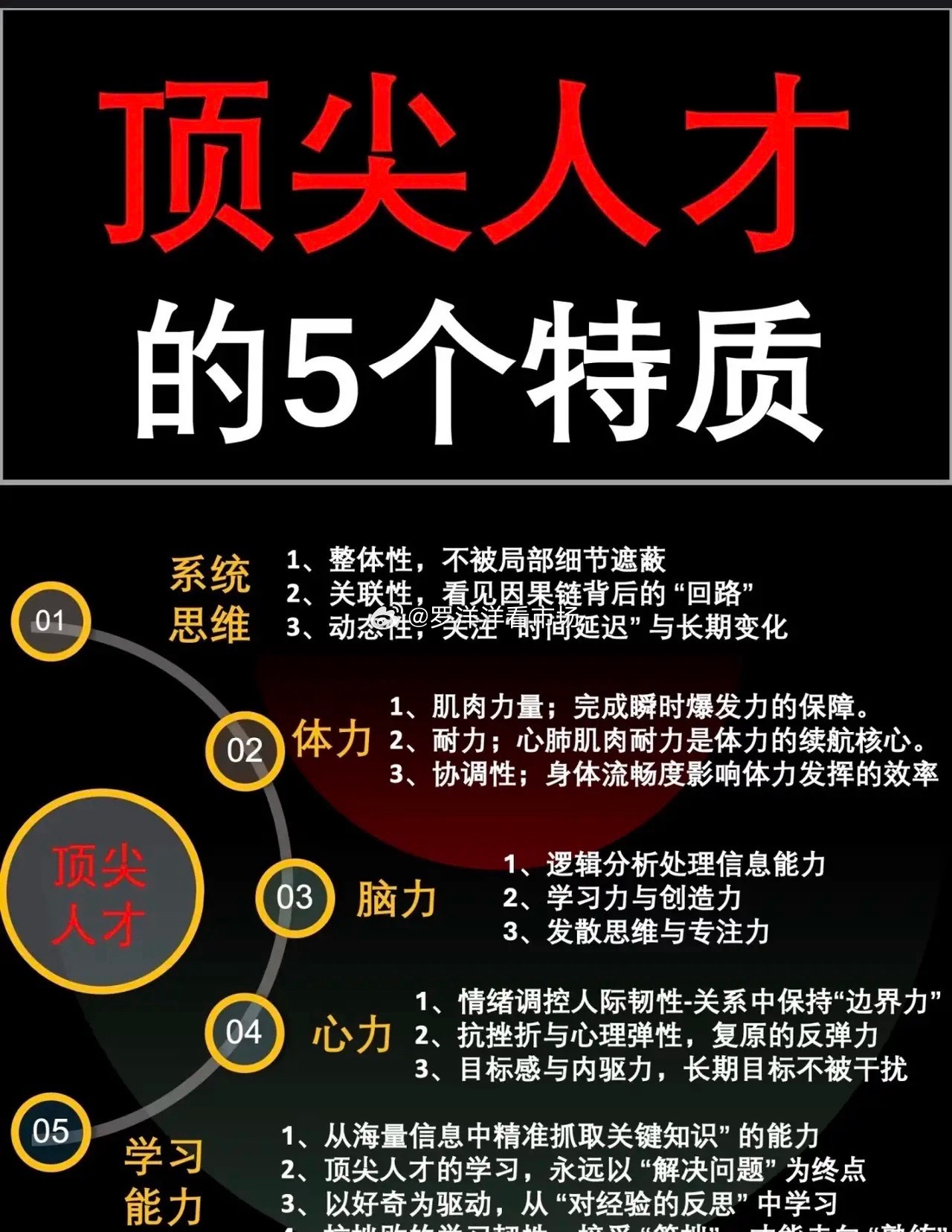 顶尖人才的5个底层逻辑模型,这5个维度,才是拉开差距的关键提到“顶尖人才”,很多人第一反应是“智商高”“能力强”——但真相是:他们从不是某一项技能的“孤勇者”,而是5个维度的“协同玩家”。这张图里的“系统思维、体力、脑力、心力、学习能力”,恰恰是一套闭环的“顶尖人才底层逻辑”。1. 系统思维:别做“捡芝麻丢西瓜”的执行者顶尖人才的第一个核心,是“跳出细节看全局”的系统思维:• 整体性:比如职场中,普通员工盯“今天要完成的报表”,顶尖者会想“这份报表是项目复盘的一环,要匹配整体数据口径”;• 关联性:不是只看“A导致B”,而是看到“B反过来影响A”的回路——比如做活动,不仅看“引流多少人”,更看“引流来的用户是否能反哺品牌口碑”;• 动态性:关注“时间延迟”——现在投入的资源,可能3个月后才见效果,不会因短期没反馈就放弃。没有系统思维,再强的能力都是“散点”,成不了“棋局”。2. 体力:脑力劳动的“隐形续航电池”你可能会疑惑:“顶尖人才还要拼体力?”答案是“必须”:• 肌肉力量是“瞬时爆发力”的保障——比如紧急项目熬夜赶工,体力差的人连坐3小时就头昏脑涨;• 耐力是“长期作战”的核心——比如科研人员连续数周攻坚,靠的是心肺耐力撑住专注力;• 协调性决定“效率上限”——身体舒展、状态松弛时,大脑运转速度会比紧绷时快30%以上。别再说“我是脑力劳动者不用练身体”——体力是所有能力的“基础底盘”。3. 脑力:不是“智商高”,是“精准输出的能力包”脑力不是“天生聪明”,而是3项能力的组合:• 逻辑分析:能从杂乱信息里抓核心——比如市场报告里,普通人看“数据涨跌”,顶尖者看“涨跌背后的用户行为逻辑”;• 学习创造:不是“学得多”,而是“学了能用来解决新问题”——比如学了一个模型,能立刻套用到自己的项目里;• 发散+专注:既能“打开脑洞想10种方案”,又能“沉下心把1种方案做到极致”。4. 心力:抗住压力的“稳定器”所有顶尖人才,都绕不开“挫败、冲突、干扰”——心力就是扛住这些的关键:• 情绪调控:和同事有分歧时,能保持“事不对人”的边界,不内耗;• 抗挫折弹性:项目失败时,不是“否定自己”,而是“快速复盘,下次调整”;• 目标感:不会被“临时琐事”带偏,始终盯着长期目标走——比如创业者不会因一次融资失败,就放弃赛道。没有心力,再强的能力都会在压力下“崩盘”。5. 学习能力:持续升级的“迭代引擎”顶尖人才的学习,从不是“囤课、记笔记”,而是4个关键点:• 抓关键知识:从海量信息里挑“能解决自己问题的内容”,不做“知识收藏家”;• 以解决问题为终点:学Excel不是“学所有函数”,而是“学能快速整理项目数据的函数”;• 反思式学习:做完一件事,会想“哪里可以优化”,而不是“做完就结束”;• 抗挫败学习:接受“一开始做得差”——比如学新技能时,不怕“笨拙”,才能慢慢练到“熟练”。最后:顶尖是“协同效应”,不是“单项满分”这5个特质,从来不是“单独点亮”:• 系统思维是“导航”,帮你选对方向;• 体力是“电池”,帮你撑住过程;• 脑力是“处理器”,帮你输出成果;• 心力是“稳定器”,帮你扛住波动;• 学习能力是“升级包”,帮你持续变好。顶尖从不是“天生标签”,而是“刻意打磨这5个维度”的结果——先搭系统思维的框架,攒足体力的续航,练强脑力的输出,稳住心力的底盘,再用学习能力持续迭代,你也能在自己的领域走到前列。