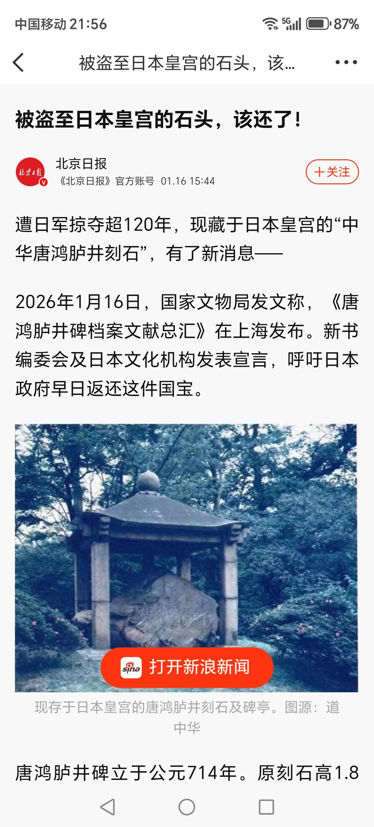 中国再次给日本上强度,开始追索被日本掠夺的中国文物,让日本在国际社会颜面扫地。《唐鸿胪井碑档案文献总汇》 重磅发布,368份史料锁死日军劫掠真相,要求日本还回来。 这是继对日稀土管制后的再次重磅出手,《总汇》的发布这是把日本如何盗取我国文物,如何侵犯我国的历史梳理的一清二楚,也直接证明了日本的强盗行为。日本将掠夺来的唐鸿胪井碑藏在皇宫内,可能自己也觉得丢人,取之不武,据说从未公开展出。现在,我们希望日本能够还回来,给我们和国际社会一个交待。除了这个唐鸿胪井碑,日本还掠夺了我国很多宝藏,一并还回来。