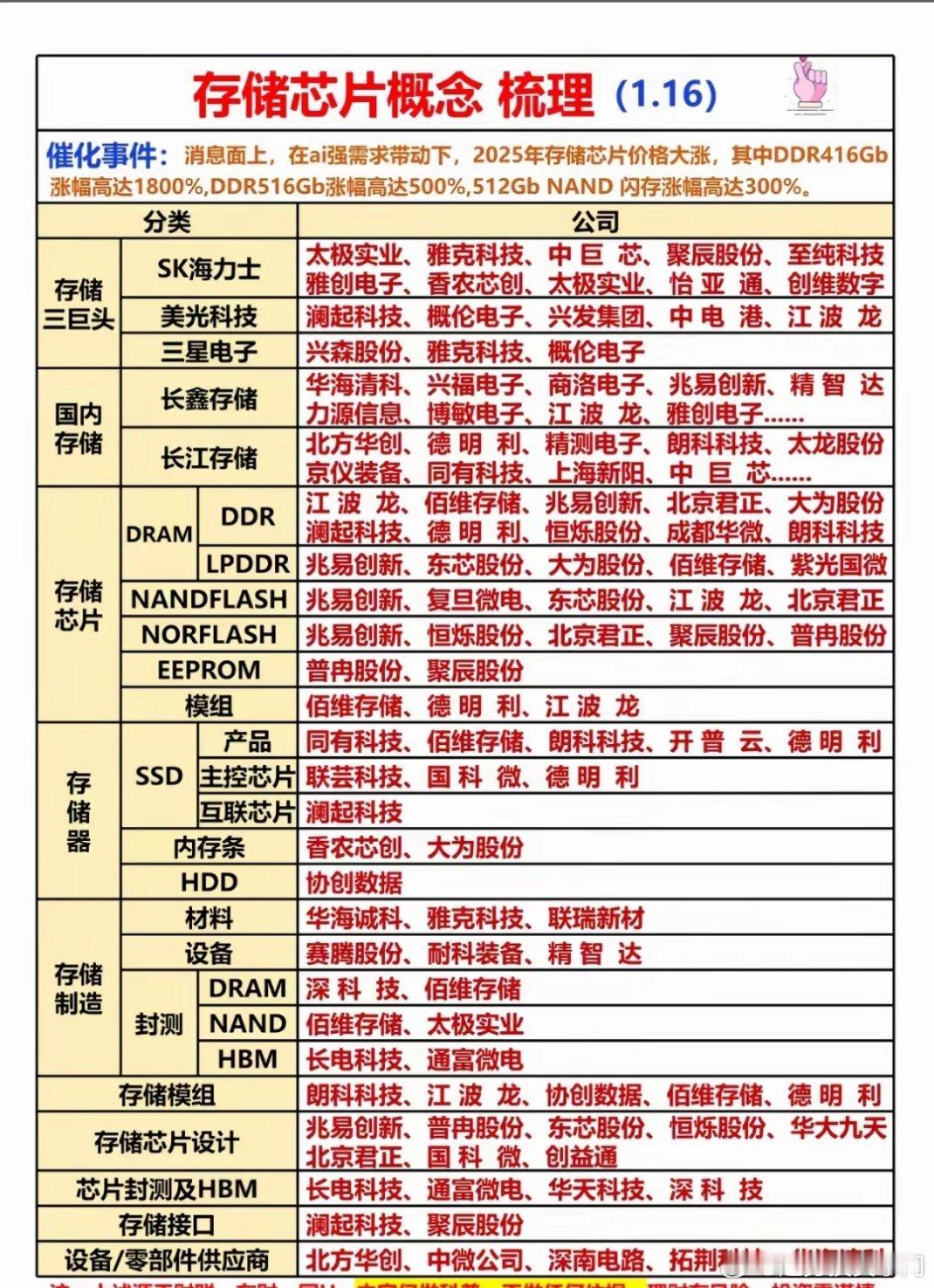 当DDR4 16Gb规格产品在十二个月内完成1800%的价格跃迁,当DDR5内存与NAND闪存同步实现翻倍增长,沉寂三年的存储芯片赛道,在2025年迎来了足以改写行业格局的史诗级爆发。太极实业、江波龙、兆易创新等产业链核心玩家,正踩着AI算力爆发与国产替代提速的双重鼓点,上演着从周期底部向价值高地的华丽逆袭。这场由技术革命点燃的产业热潮,究竟是供需失衡催生的短期脉冲,还是技术迭代与产业升级共振下的长牛起点?答案藏在全球格局重构与国内产业链的突破之中。全球存储产业的周期逻辑,已被AI时代的刚性需求彻底重塑。ChatGPT等大模型的指数级增长,推动数据中心对高带宽内存(HBM)的需求激增300%,三星、SK海力士等国际巨头纷纷将产能向高端存储倾斜,直接导致DDR、LPDDR等通用型存储产品的供给缺口持续扩大。在此背景下,国内企业的技术突围正转化为实实在在的市场份额:长江存储128层3D NAND实现规模化量产,产品性能比肩国际一流水平;长鑫存储的DDR4颗粒在消费电子领域市占率突破15%,打破海外厂商长期垄断;兆易创新的NOR Flash产品更是拿下全球30%的市场份额,成为细分领域的隐形冠军。这些技术突破不再是实验室里的孤例,而是转化为业绩增长的核心动力,让国产替代从政策口号走向产业现实。深入产业链各环节,差异化的投资逻辑已然清晰。封测领域,太极实业、长电科技凭借成熟的HBM封装技术,成为AI服务器供应链的核心受益者;接口芯片赛道,澜起科技在DDR5时代市占率超70%,构筑起难以逾越的技术壁垒;模组制造环节,江波龙、佰维存储通过深度绑定AI服务器厂商,持续享受算力扩张带来的需求红利。更具产业意义的是,存储制造设备与材料领域的国产替代正进入攻坚破局的关键阶段:北方华创的刻蚀机成功切入长江存储供应链,实现核心设备的自主化突破;雅克科技的湿电子化学品打破海外垄断,为存储制造提供关键材料支撑;精智达的测试设备在DRAM产线实现批量交付,填补了国内相关领域的空白。这些突破不仅让国内产业链摆脱了“卡脖子”的风险,更在全球存储产业分工中抢占了高附加值环节,为行业长期发展奠定了坚实基础。站在投资者视角,当前存储芯片行情的核心矛盾在于周期弹性与成长价值的交织共振。短期维度,价格暴涨带来的业绩弹性已初步显现,2025年一季度太极实业、兆易创新等龙头企业净利润同比增速普遍突破200%,周期反转的红利持续释放;中期来看,AI算力需求的持续扩张与3D NAND、HBM3等技术迭代的双重驱动,正推动行业从传统周期属性向成长属性切换,市场空间迎来量级式提升;长期展望,长江存储、长鑫存储的产能爬坡与技术升级,有望推动中国在全球存储市场的份额从当前的8%提升至2030年的25%,彻底打破三星、美光、SK海力士“三巨头”主导的产业格局,重塑全球存储产业的竞争版图。机遇背后,风险同样不容忽视。海外巨头的产能扩张可能引发行业供需关系重构,进而触发价格战;地缘政治的不确定性可能影响核心设备与技术的进口;技术迭代速度的加快,对企业的研发投入与创新能力提出了更高要求。但这些挑战亦是行业洗牌的契机,具备核心技术壁垒、规模化产能与深度客户粘性的龙头企业,将在激烈的市场竞争中进一步巩固优势,推动行业集中度持续提升。当AI大模型对存储容量与速度的需求呈指数级增长,当国产替代的浪潮席卷产业链各个环节,存储芯片的黄金时代才刚刚拉开序幕。对于投资者而言,唯有穿透短期价格波动的迷雾,读懂周期反转与技术升级的双重逻辑,把握产业链各环节的突围机遇,方能在这场深刻的产业变革中,捕获属于自己的财富密码。