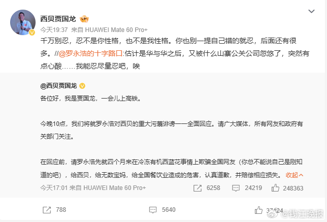 【#贾国龙让罗永浩千万别忍#】#贾国龙今晚10点全面回应# 1月16日,发文喊话罗永浩 ,让其就四个月来在冷冻有机西蓝花事情上欺骗全国网友,给西贝、无数宝妈以及全国餐饮业造成的危害,认真道歉,并赔偿相应损失。#罗永浩回应贾国龙喊话##贾国龙让罗永浩道歉赔偿# 对此,罗永浩转发该博文称:“估计是华与华之后,又被什么山寨公关公司忽悠了,我能忍尽量忍吧!” 随后,贾国龙再回应罗永浩称:“千万别忍,忍不是你性格,也不是我性格,你也别一提自己错的就忍,后面还有很多。”