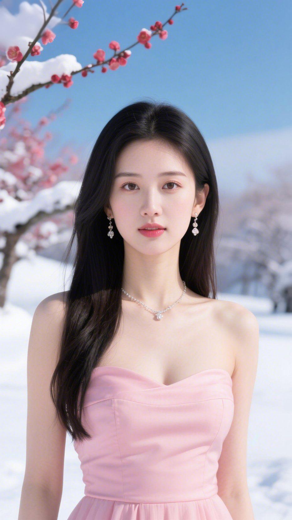 粉裙映雪,梅香漫冬 雪后的天地一片素白,红梅枝桠顶着碎雪,在蓝天映衬下格外鲜亮。一袭粉裙立于雪间,像揉碎的春阳落进了冬的清冷里,裙身的柔粉与枝头的艳红相映,让凛冽的寒风也添了几分柔和。 不必刻意寻春,就站在这雪地里,任长发拂过肩颈,耳饰的碎钻随微风轻晃。我们总在寒冬里盼着暖意,却忘了眼前的粉裙与红梅,就是冬日里最温柔的浪漫。粉裙的柔婉与雪的清冽相融,像把春日的桃花瓣裁成了衣料,把凛冽寒冬过成了诗。 忙碌了一整年,卸下疲惫的行囊,在雪梅间与这份温柔相遇——不必等春暖花开,不必盼烟火团圆,一身轻盈的裙装,一树盛放的红梅,就足以让人心头泛起温软的涟漪。 风掠过耳际时,带着梅香与雪的清润气息。这一瞬的静立,是粉裙与冬雪的相遇,也是我们与岁月温柔的和解。 冬日氛围感 雪间浪漫