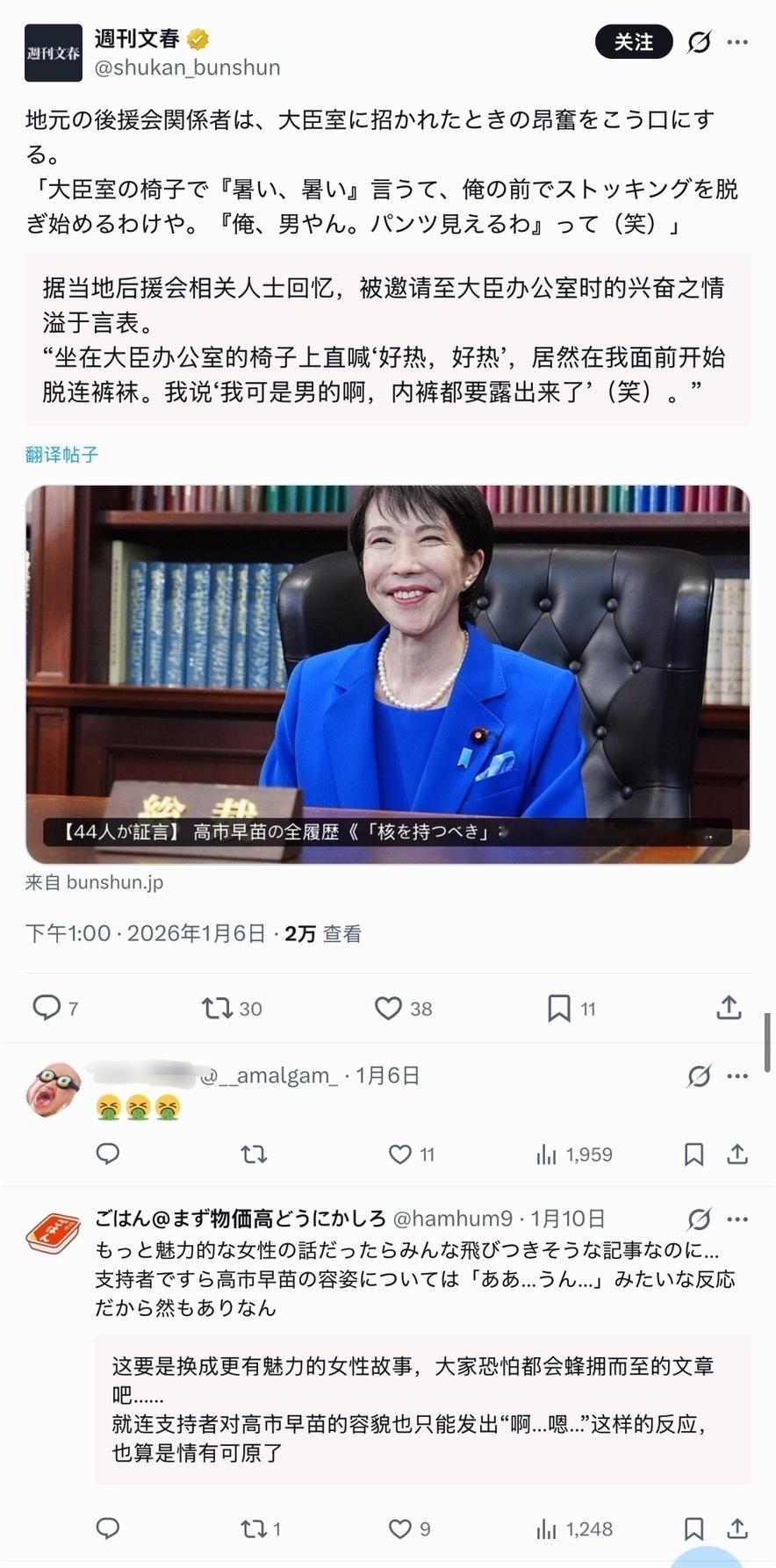 日本被打到七寸了 日本文春报道,高市早苗曾经这样对男同事(恶心慎点,但这是日本文春的正规报道)