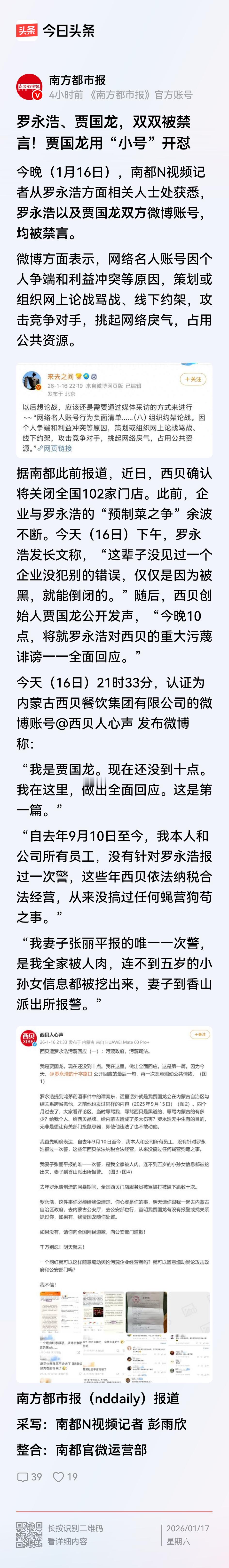 罗永浩贾国龙微博被禁言,建议对他们封号! 怎么又打起来了?西贝事件刚刚消停几个月,怎么又在网络上干起来了。而且一来就是气势汹汹。 今晚(1月16日),南都N视频记者从罗永浩方面相关人士处获悉,罗永浩以及贾国龙双方微博账号,均被禁言。 即便如此,他们还是通过小号继续论战,颇有点约架的意思。所以,我觉得网络不仅对他们禁言,还应该大号小号都封掉。再不封,就要成为全民约架了。尤其是贾总,已经造成巨大损失了,咱就别在跟这无赖争辩了。