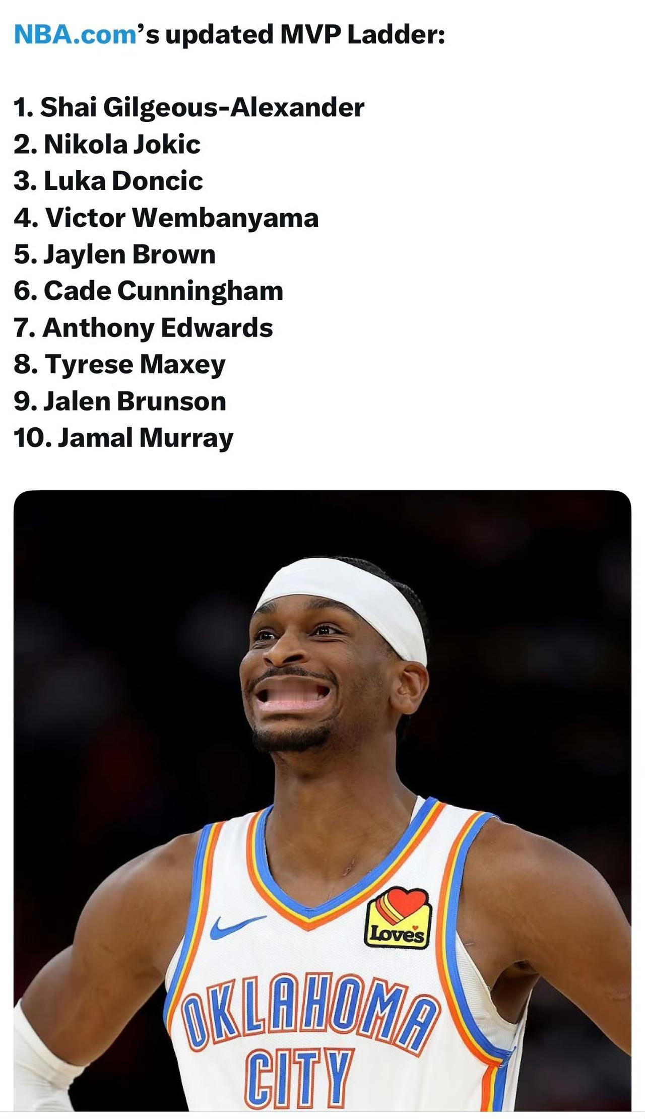 官网更新MVP榜,亚历山大超越约基奇来到第一位,东契奇回到第三,穆雷杀入前十。 1. 谢伊·吉尔杰斯-亚历山大(雷霆) 2. 尼古拉·约基奇(掘金) 3. 卢卡·东契奇(湖人) 4. 维克托·文班亚马(马刺) 5. 杰伦·布朗(凯尔特人) 6. 凯德·坎宁安(活塞) 7. 安东尼·爱德华兹(森林狼) 8. 泰雷斯·马克西(76人) 9. 杰伦·布伦森(尼克斯) 10. 贾马尔·穆雷(掘金)