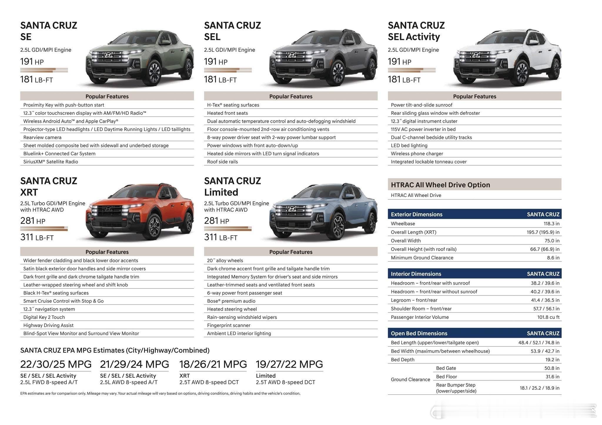 2025现代SANTA CRUZ是一款紧凑型皮卡,基于现代的N3平台打造,与途胜是姊妹车型。现代Santa Cruz是城市友好型一体式紧凑型皮卡,核心优势是驾乘质感佳、配置丰富、质保给力,短板集中在货箱/后排空间、价格、极限承载,适合轻量使用与日常通勤。一体式车架+前麦弗逊后多连杆,公路驾驶接近SUV,转向精准、底盘扎实、易于泊车;2.5T版281马力,货箱带锁止式内置储物格(可当冷柜),高配带集成式卷帘盖;后排座椅可翻折,下方另有储物空间,装载灵活。适合追求SUV驾乘感、仅需轻量装载与偶发拖拽、看重配置与质保的城市用户。