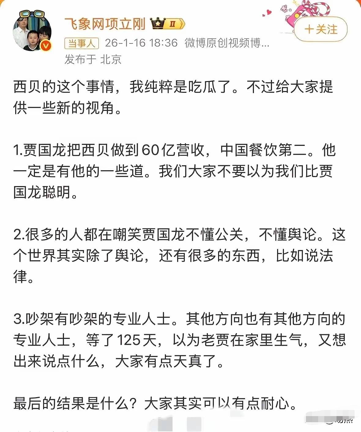 提線&木偶 2 2026-01-17 10:54 有啥耐心?法律难道能超脱“公序良俗”之外吗?保质期两年的西兰花你告诉我不是预制菜?关闭30%门店,4000员工失去工作,他敢公布这4000员工都是什么岗位吗?有一个厨子吗?不都是转微波炉计时器的?