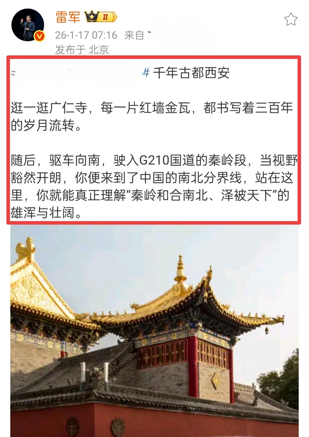 小米雷军先生在1月17日到西安走了一趟。 雷军来到了西安的广仁寺,这座寺庙已经有三百多年的历史了。广仁寺的风格并非汉传佛教的单一风格,而是同时兼具汉族与藏族两种风格,寺庙内部装饰中还有蒙古族的一些文化标志,这也是多民族融合的历史特征。 雷军先生说,广仁寺的“红墙金瓦”书写着三百年的岁月流转。这番评价还是很贴切的。红墙金瓦从侧面反映了这是官方主持修建的寺庙,寺庙修建的主体材料在当时来说还是很豪华的。 雷军先生还引用了一句重要论述,点明了秦岭在地理上的特殊性,它不仅是长江、黄河部分支流的发源地,在水文与气候领域也占据着重要地位。