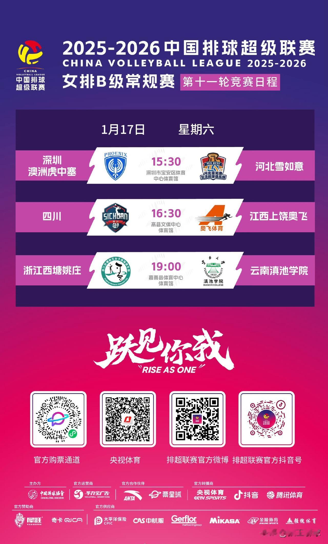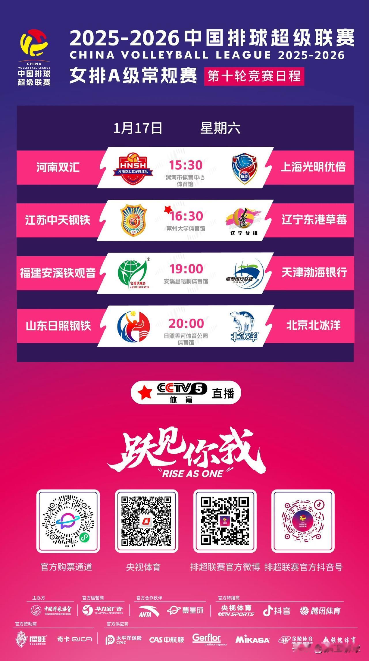 【今日17日女排联赛A级B级赛程】 2025-2026中国排球超级联赛,1月17日 女排超级联赛A级常规赛赛程 15:30 河南双汇 vs 上海光明优倍(漯河) 16:30 江苏中天钢铁 vs 辽宁东港草莓(常州) CCTV5 19:00 安溪铁观音 vs 天津渤海银行(安溪) 20:00 山东日照钢铁 vs 北京北冰洋(日照) 微博、央视频、DY和企鹅都有直播 常规赛B级第11轮展开争夺,具体赛程如下: 15:30 深圳澳洲虎中塞 vs 河北雪如意 16:30 四川女排 vs 江西上饶奥飞 19:00 浙江西塘姚庄 vs 云南滇池学院