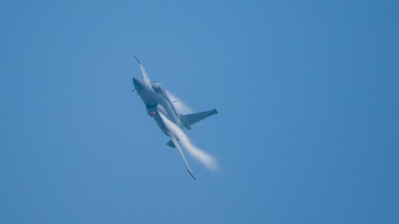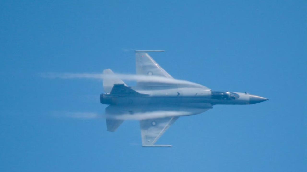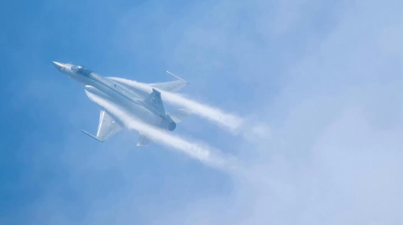 绝美!巴基斯坦"枭龙"Block3战机的边条翼涡流。 巴基斯坦空军“枭龙”Block 3的边条翼设计因其独特的“哥特式尖拱”造型和大迎角下产生的高强度稳定涡流。 大迎角飞行时,尖拱型边条能产生强度更高、稳定性更强的脱体涡流。这些涡流沿主翼上表面流动,形成低压区,显著增加机翼升力