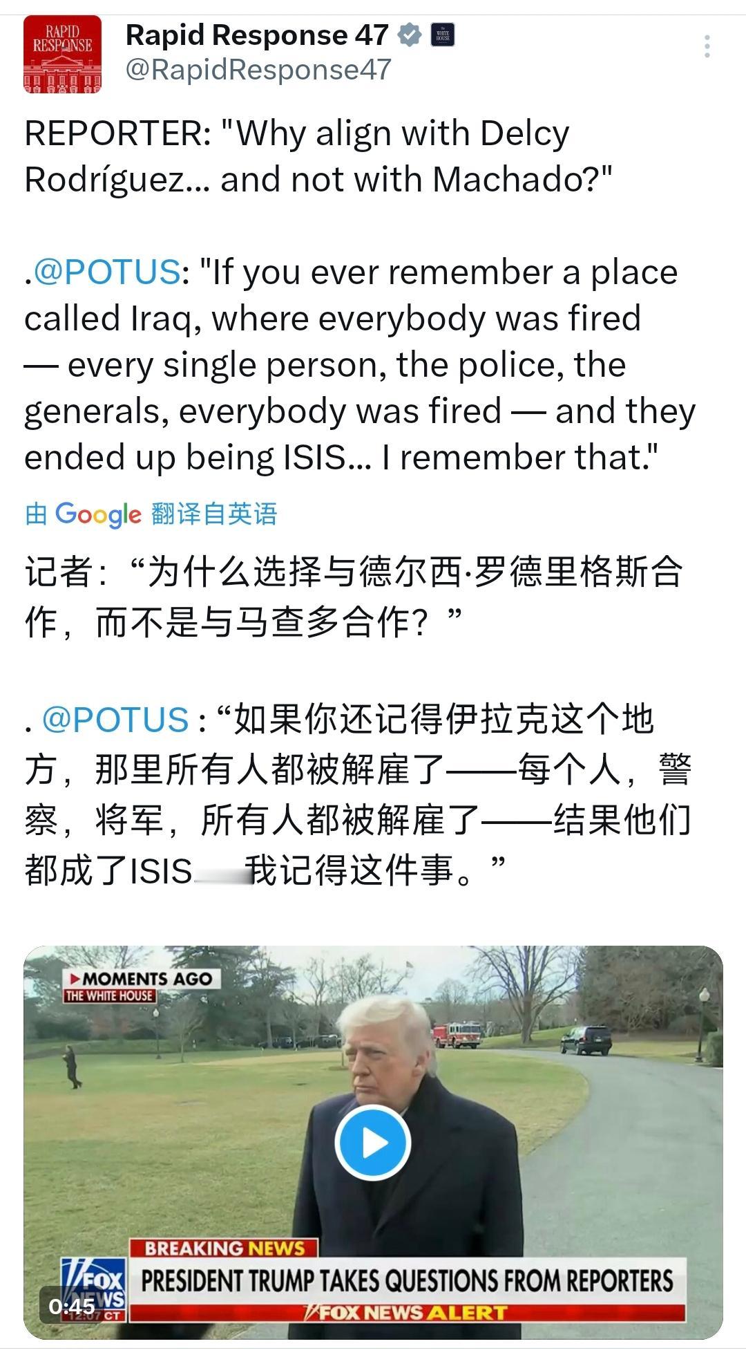 记者:“为什么选择与德尔西·罗德里格斯合作,而不是与马查多合作?” 特朗普:“如果你还记得伊拉克这个地方,那里所有人都被解雇了——每个人,警察,将军,所有人都被解雇了——结果他们都成了ISIS......我记得这件事。” [机智]评几句:特朗普选择与临时总统罗德里格斯合作而非马查多,绝非什么政治善意,而是赤裸裸的务实算计。他拿伊拉克旧事当幌子,无非是想借稳定局势的名义,牢牢攥住石油利益这块肥肉——毕竟动荡只会搅乱石油交易,唯有政局平稳,才能让美国资本安心分羹。马查多或许能迎合部分政治噱头,却未必能镇住盘根错节的利益格局,而罗德里格斯的执政根基更稳,能为特朗普的石油野心保驾护航。特朗普的选择撕下了美式民主的遮羞布,说到底,所谓的盟友取舍,不过是围绕石油利益的精准押注,稳定只是攫取利益的敲门砖。