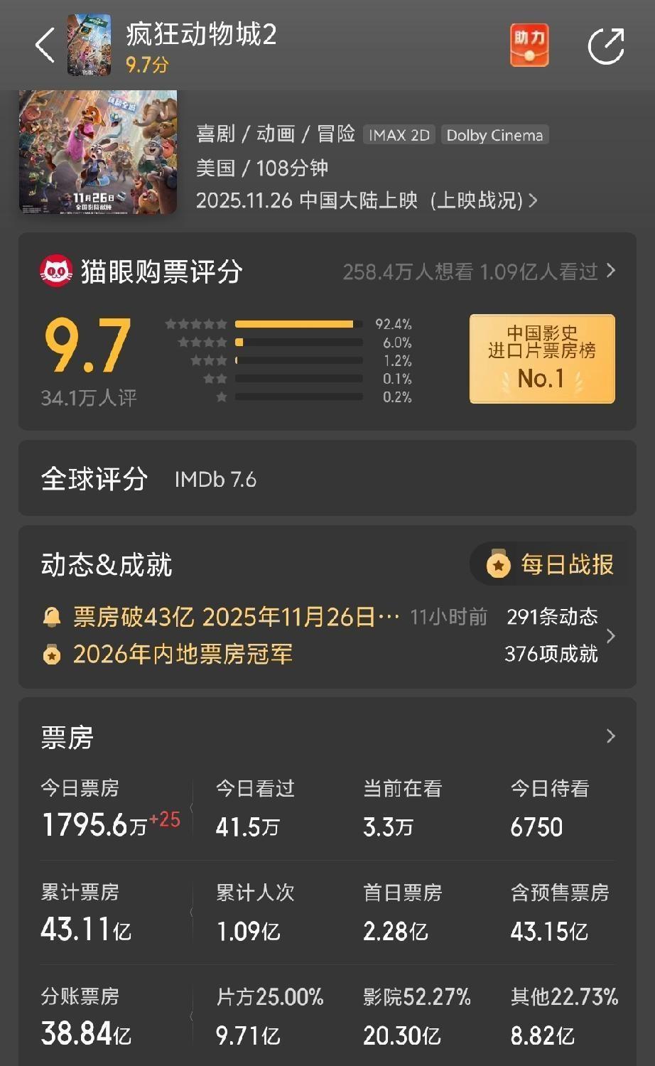 别再信好莱坞养活全球的鬼话了,真相是,全球最大的影厅正在给好莱坞片方“发工资”。 你捏住了一张能决定《疯狂动物城2》生死的票。 它全球18亿收入,近半来自中国。43亿人民币票房,是北美市场的整整两倍。 中国观众一抬手,就能把一部A级大片托上盈亏线。 好莱坞片方现在开会,第一页PPT必须是中国市场。 IMAX在中国创下1.2亿美元纪录,《沙丘2》掐着表同步北美上映。 他们改了档期,改了营销,甚至为你定制彩蛋。 这不是讨好,这是生存。 去年549亿总票房,国产片占了83.4%。 但顶级好莱坞制作依然能在这里挖走43亿。 结论很残酷:中国观众不是厌烦好莱坞,而是厌倦流水线。 你的钱包,只对顶级手工艺敞开。 市场规则正在重写。 过去你为好莱坞的规则买单,现在好莱坞为你的喜好改规矩。 从票仓到棋盘,你坐上了制定游戏规则的那一侧。 中国票房新秩序