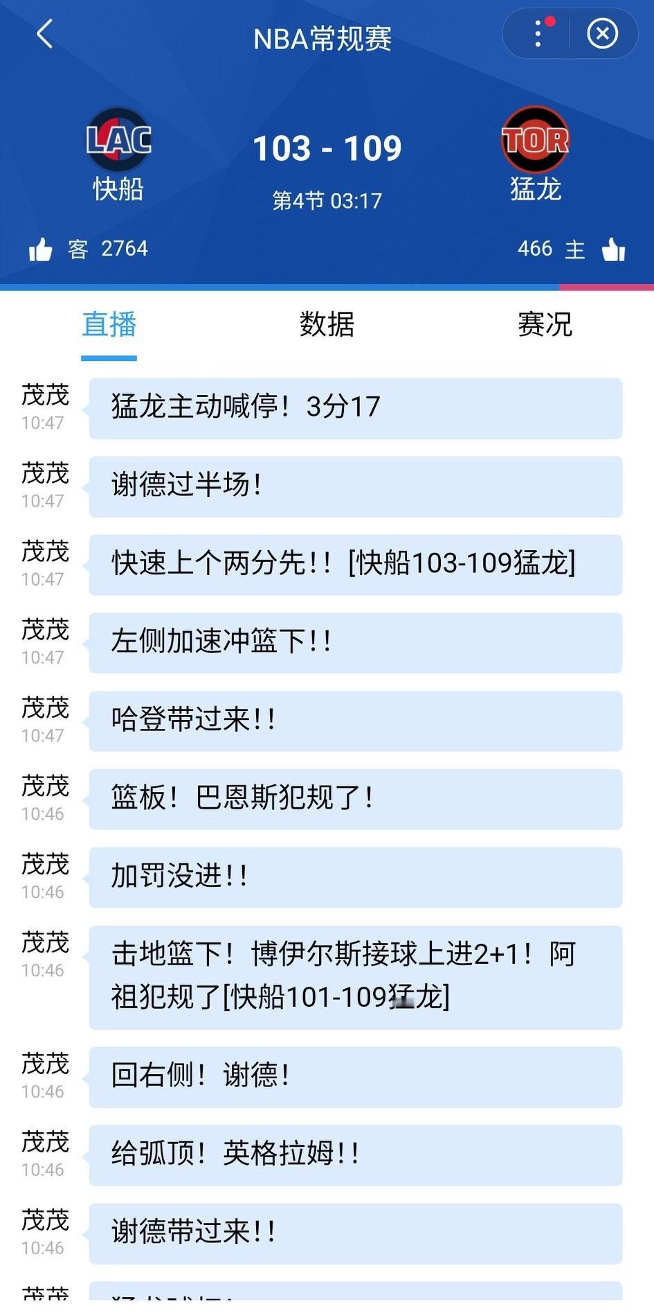 第四节初,快船好不容易将比分追到只差2分,现在又被拉大到6分,还有希望吗? 哈登19分10助攻2篮板。快船103-109猛龙。