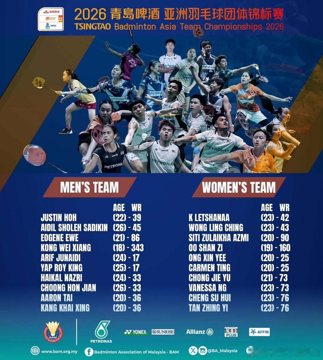 大马羽协公布亚团赛名单:男队:贺首维、艾迪尔、尤阳、江伟翔阿里夫/叶睿庆、钟鸿健/海卡尔、江凯兴/戴伟钦女队:蕾莎娜、黄玲青、祖莱卡、余善资王馨渝/陈韦妏、钟洁瑜/吴保莲、钟舒卉/陈心瑀2026亚洲羽毛球团体锦标赛