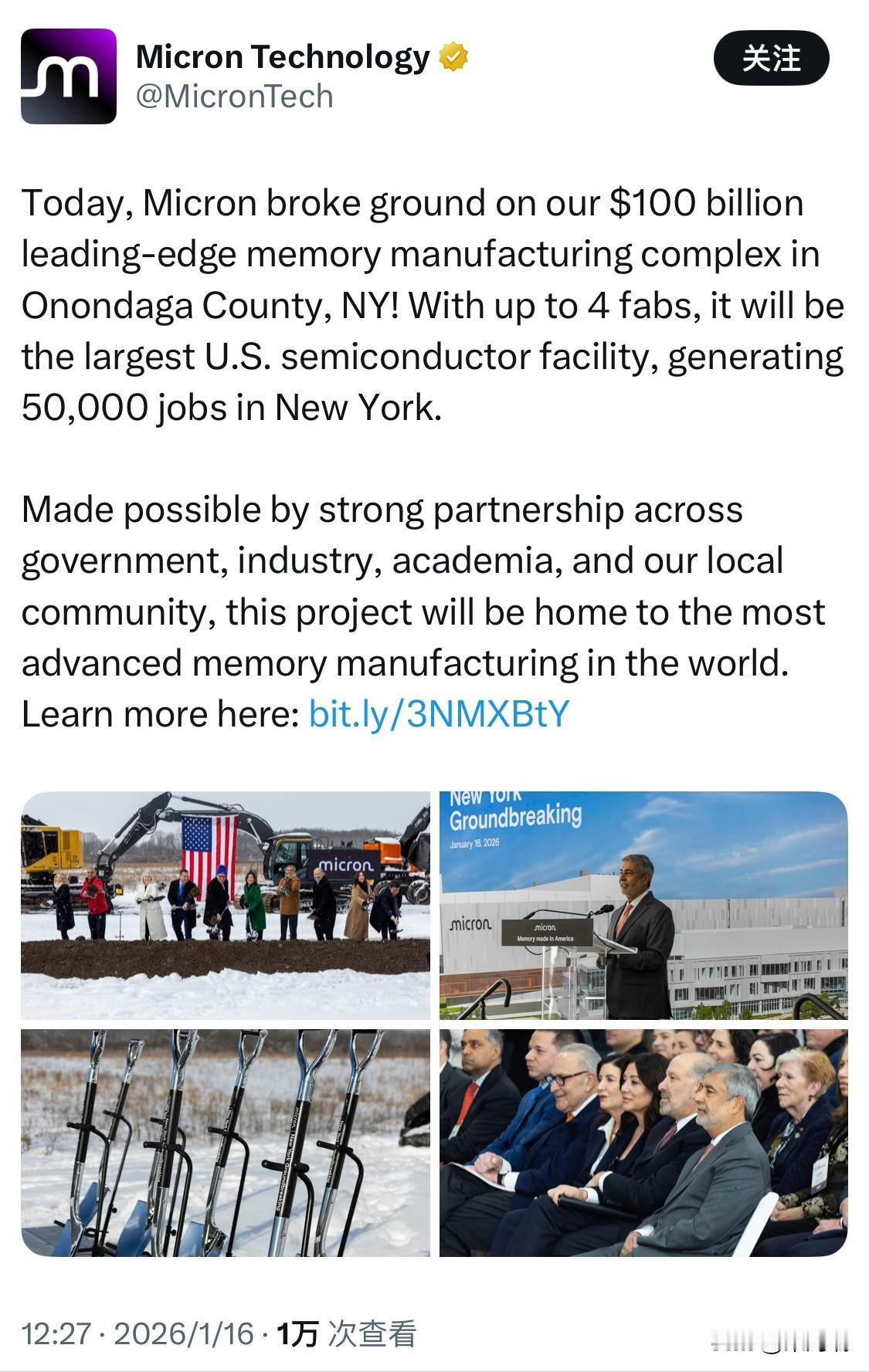 今天,美光科技(Micron Technology)在纽约州奥农达加县(Onondaga County)克莱镇(Clay)的这座超级晶圆厂正式破土动工,该项目是美国历史上最大的私人投资项目之一。 该项目的关键细节: 投资规模:美光计划在未来20年内投资高达 1000亿美元。 建设内容:该综合体最终将包含 4座面积各为60万平方英尺的晶圆厂(总计240万平方英尺,相当于约40个足球场大),专门生产尖端 DRAM 存储芯片。 就业影响:预计将直接创造 9,000个美光职位,并带动全州约 40,000个辅助职位(包括供应商及建筑行业)。 政策支持:该项目得到了联邦《芯片与科学法案》(CHIPS and Science Act)的直接资金补贴(约61亿美元用于美光在纽约州和爱达荷州的项目)以及纽约州约55亿美元的税务激励。