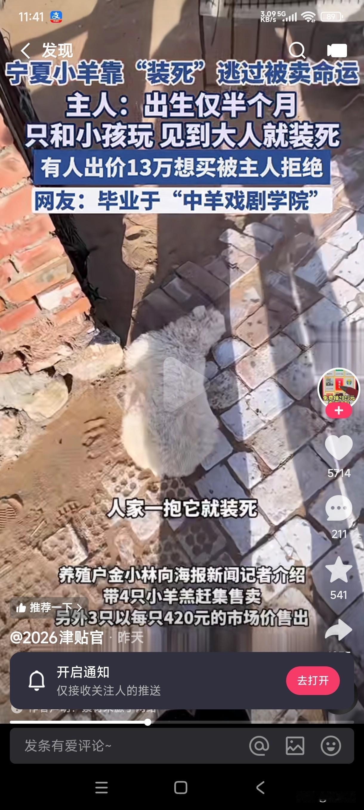 宁夏装死网红羊真有这么神奇吗?大人靠近它就装死,小孩靠近玩它就活蹦乱跳的,居然有人出价 13万想买被主人拒绝。 这只小羊羔是不是毕业于中羊戏剧学院,真不敢相信它居然有装死的特长,它是用装死来逃脱被卖的命运,还是主人给它用了什么特殊手段来让它装死的?有网友说羊的身上肯定有电圈之类的东西,远程操控就把它电晕了,这是羊的主人为了吸引流量故意这么搞的,还从来没有见过羊见了大人就装死,见了小孩活蹦乱跳的玩,这是不是有点像电影里面的情节了? 不知道这装死小羊的装死动作是如何做到的,羊主人把它发到网上后网友们也百思不得其解,但这装死神态还真是有目共睹的,面对如此神奇的小羊,居然有网友愿意出13万购买,但却遭到了羊主人的拒绝,有人愿意出13万买一只小羊羔,这羊主人为什么就不卖呢?宁夏网红装死羊 网红装死羊