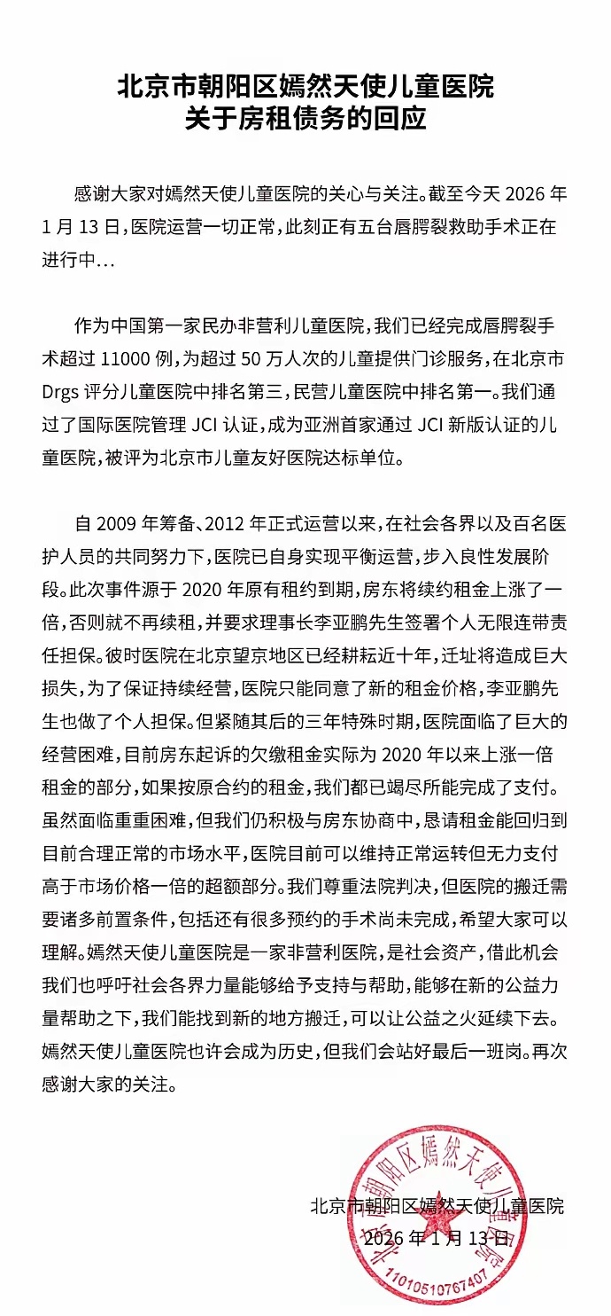 房东回应嫣然医院疫情续约租金翻倍北京嫣然天使医院的房东要求李亚鹏公开道歉,亚鹏称“嫣然天使儿童医院也许会成为历史,但我们会站好最后一班岗”。李亚鹏与韩红的经历如出一辙,都印证了明星公益的不易。但李亚鹏的经历也证明,公益从来不是一帆风顺的坦途,它需要情怀,更需要直面现实的勇气。