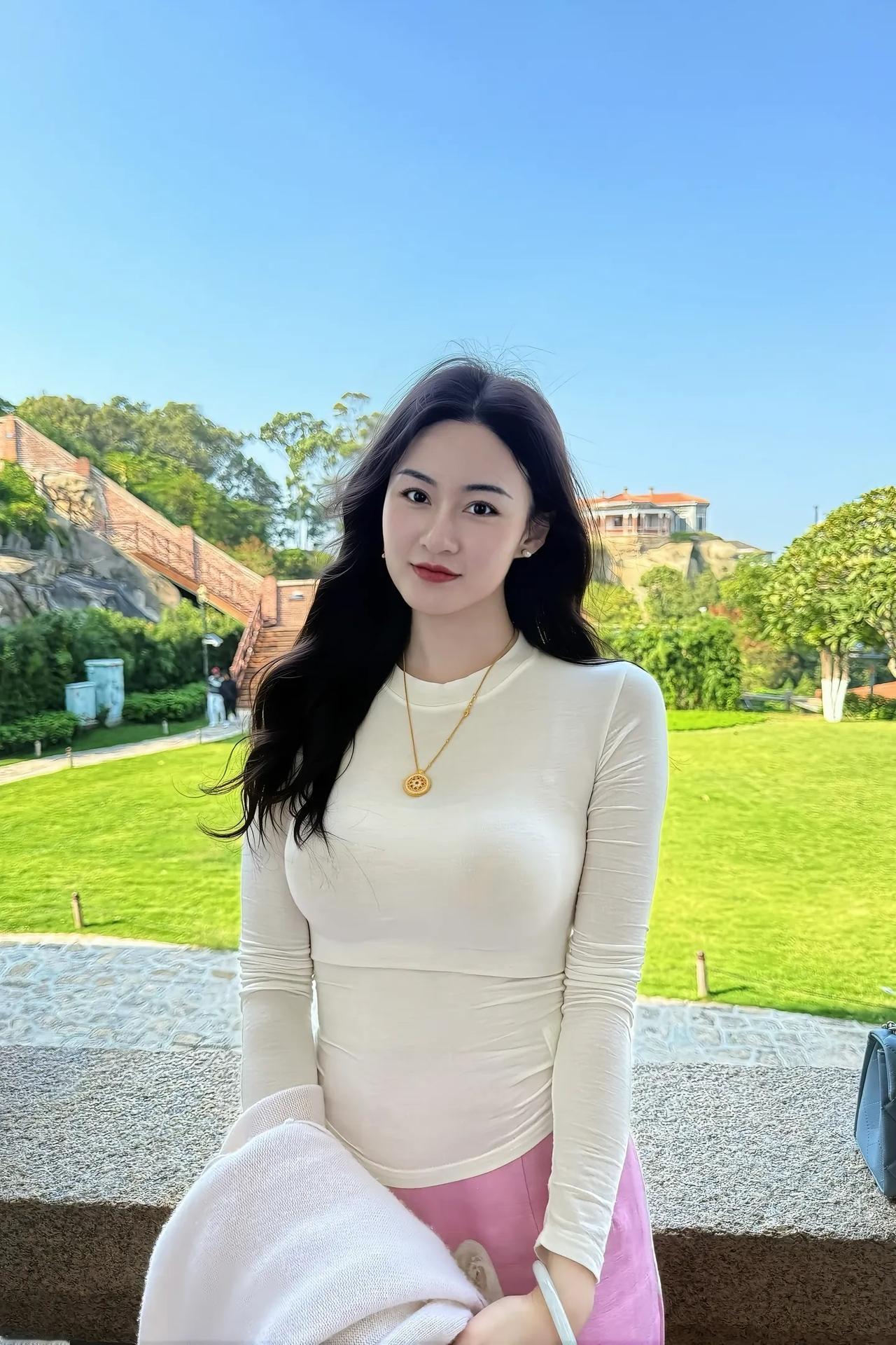 阳光明媚的一天,绿意盎然的公园里,一位美丽的女孩微笑着面对镜头。